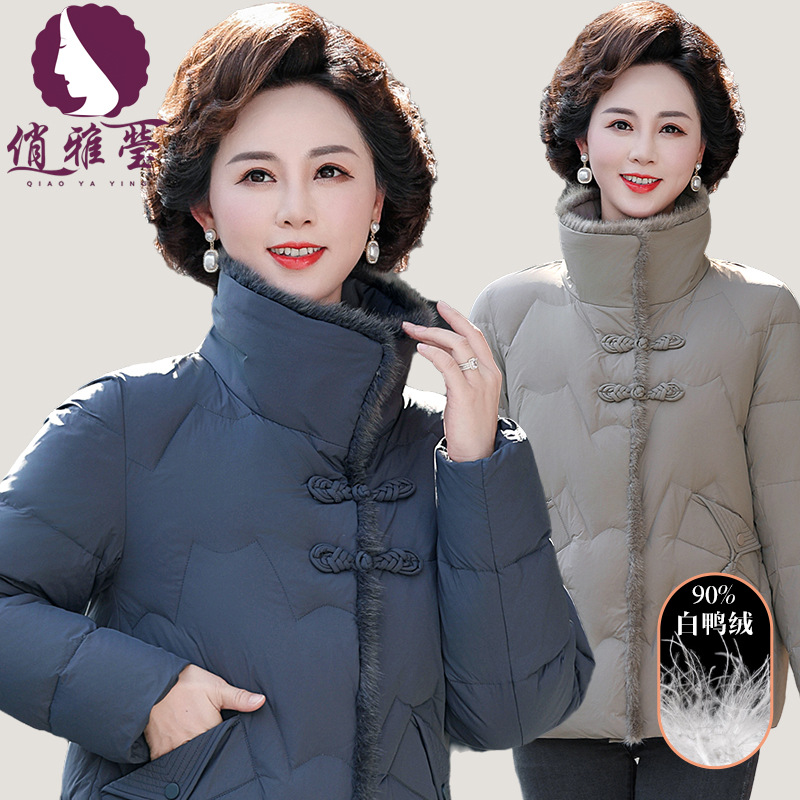 ファッションの新しい中国式のお母さんのダウンジャケットの女性の冬の新型の帽子の保温の中高年の婦人服の白いアヒルの羽毛のコート