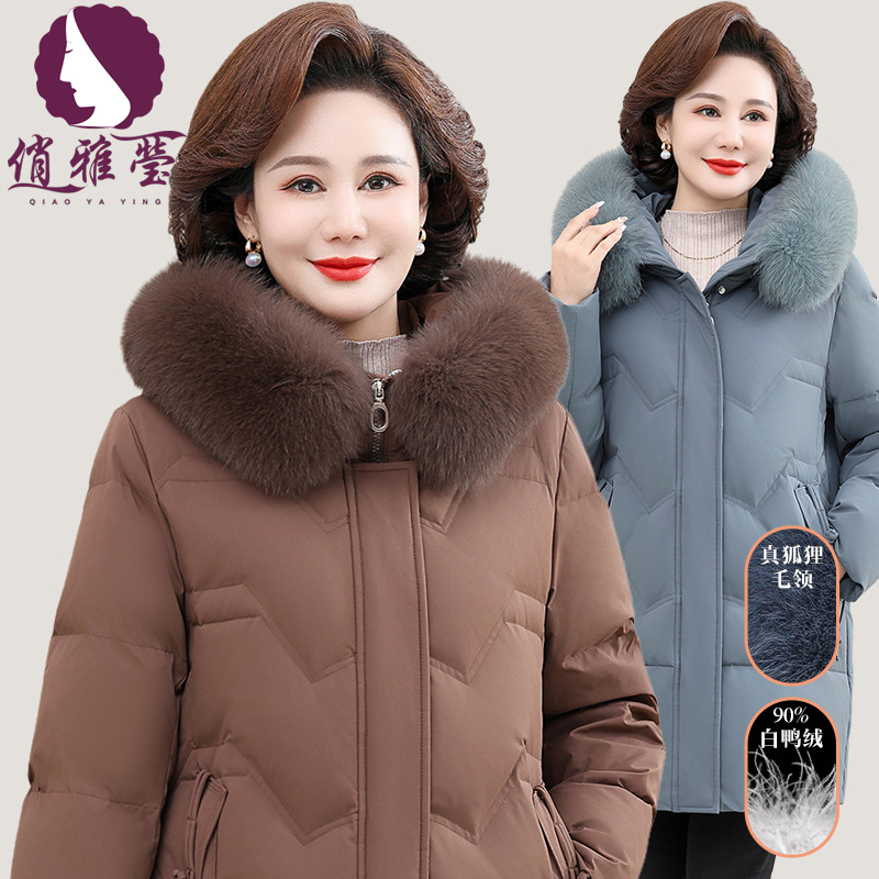 中老年女装冬季新款白鸭绒外套可拆卸毛领大码妈妈装羽绒服上衣