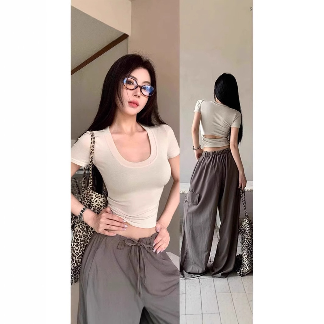 夏のホットガールスタイル痩身Uネックへそ出し半袖Tシャツ女性用、背中が露出したショートトップ女性用
