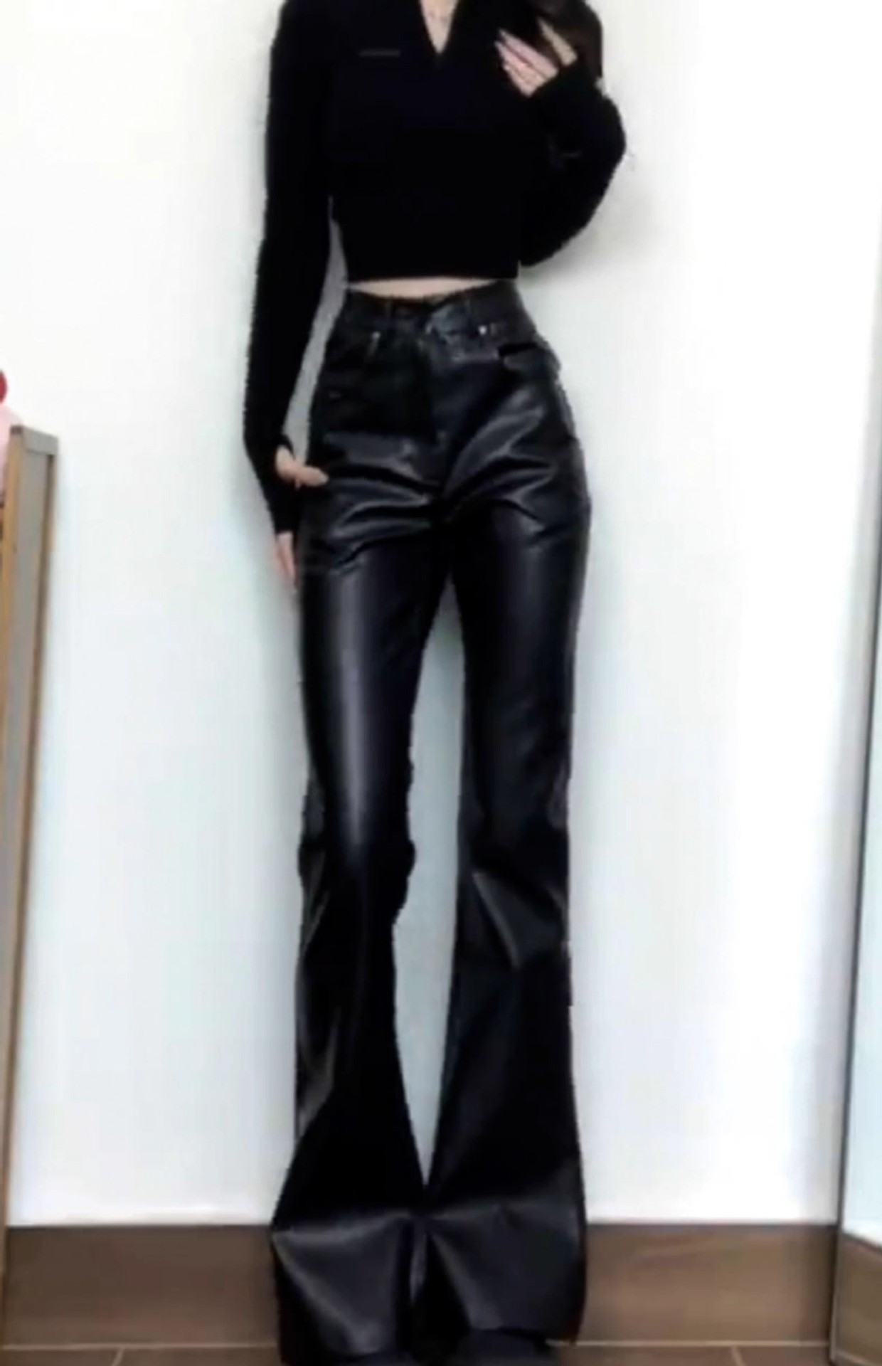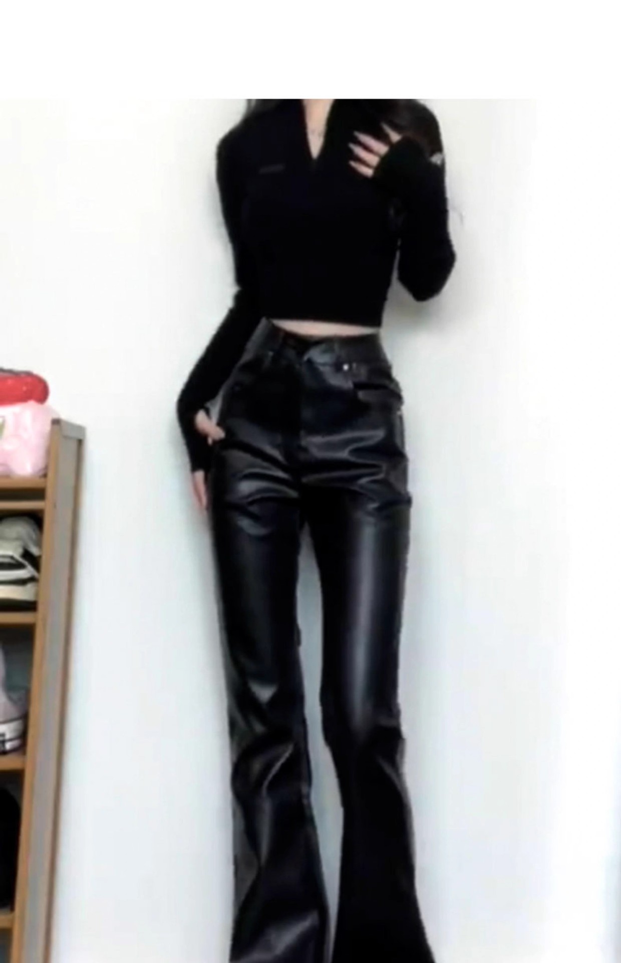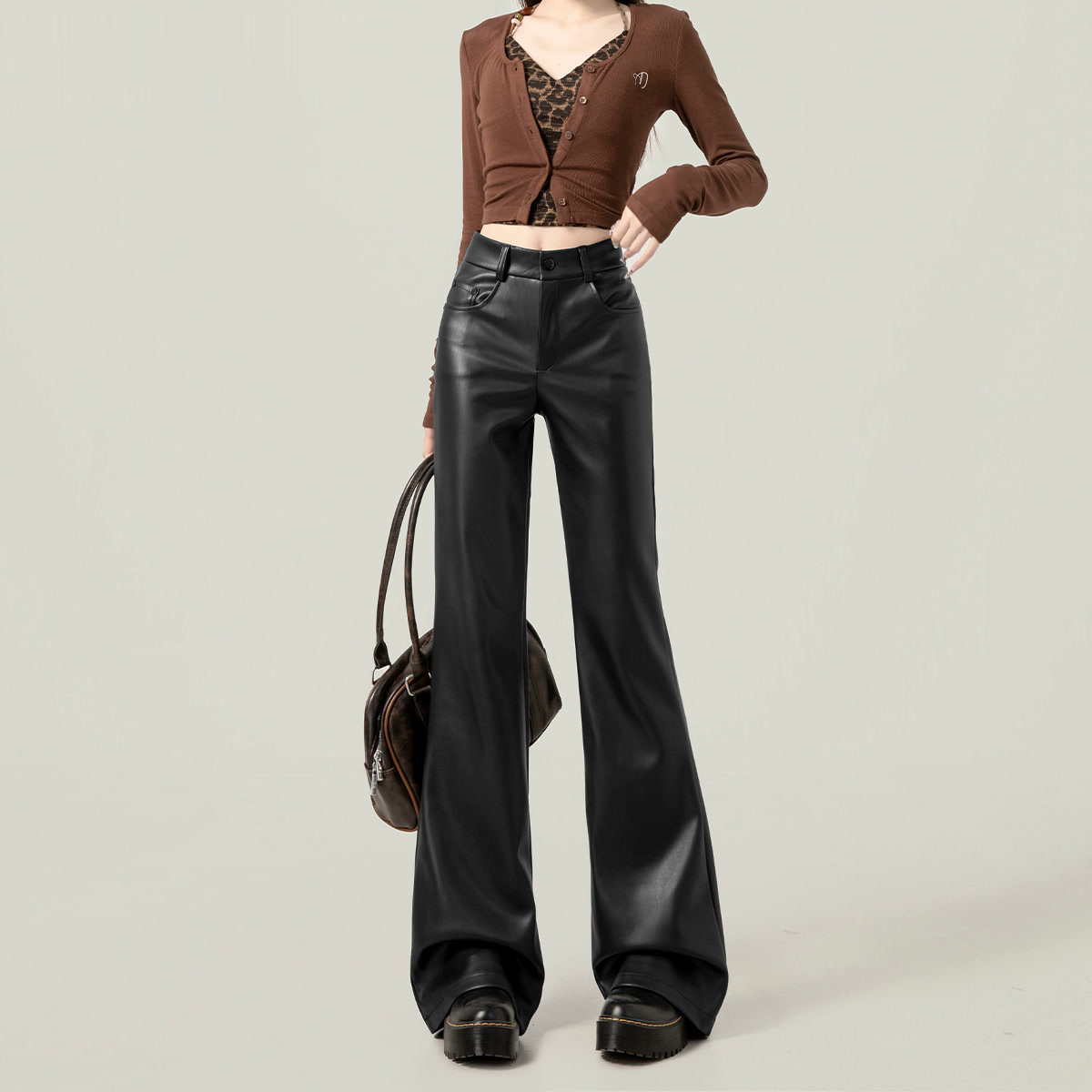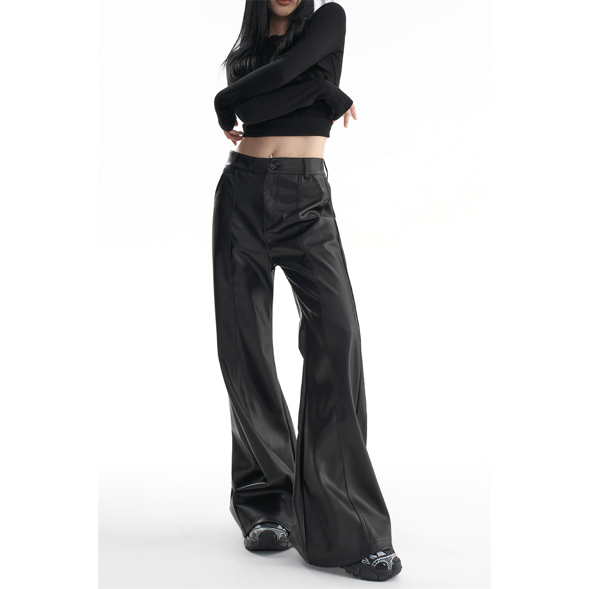アメリカ式の黒いマイクロラッパpuの皮のズボンの女性の2025年の春秋の新型の小さい背の高い腰のゆったりしているラッパのズボン
