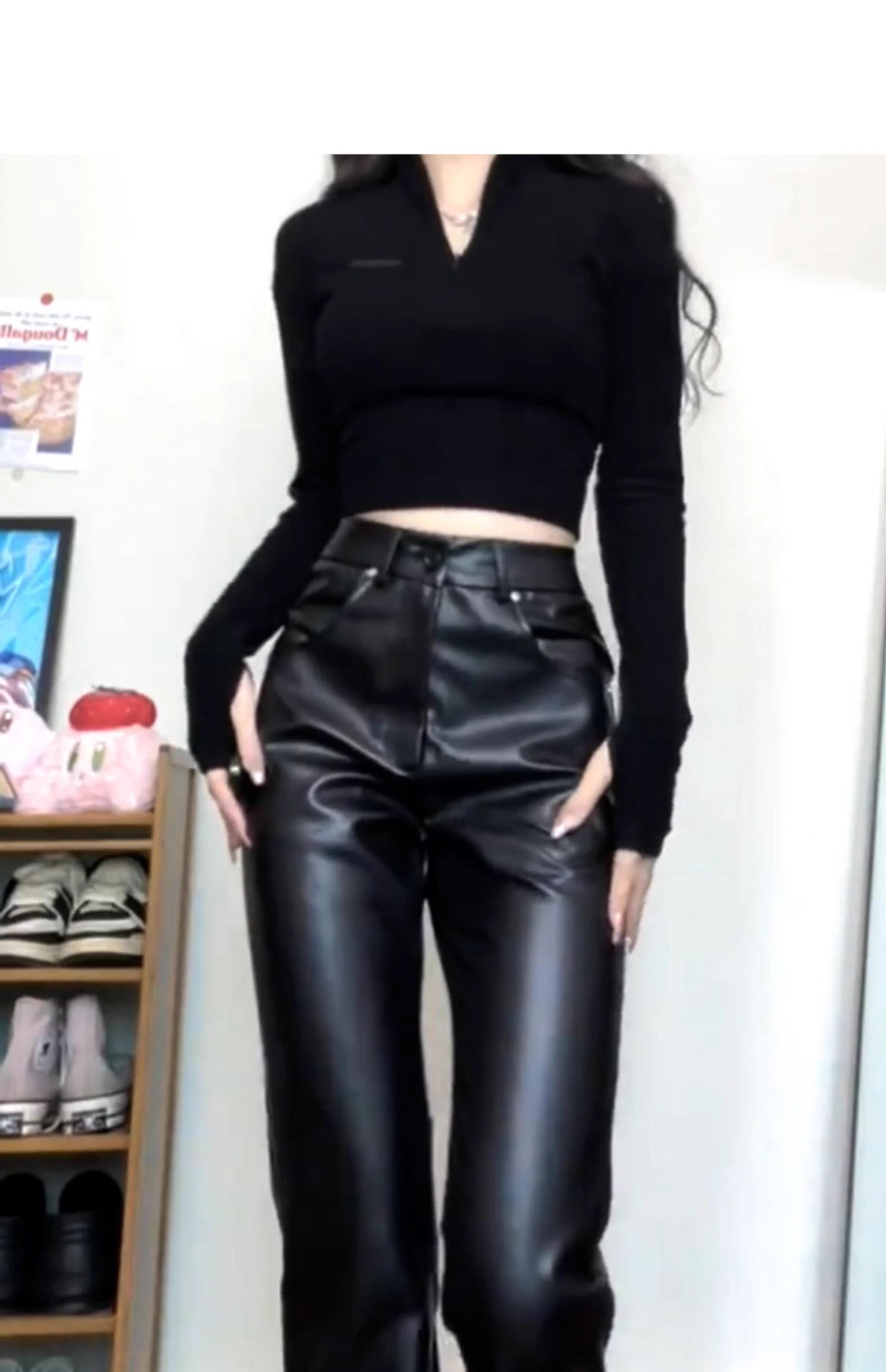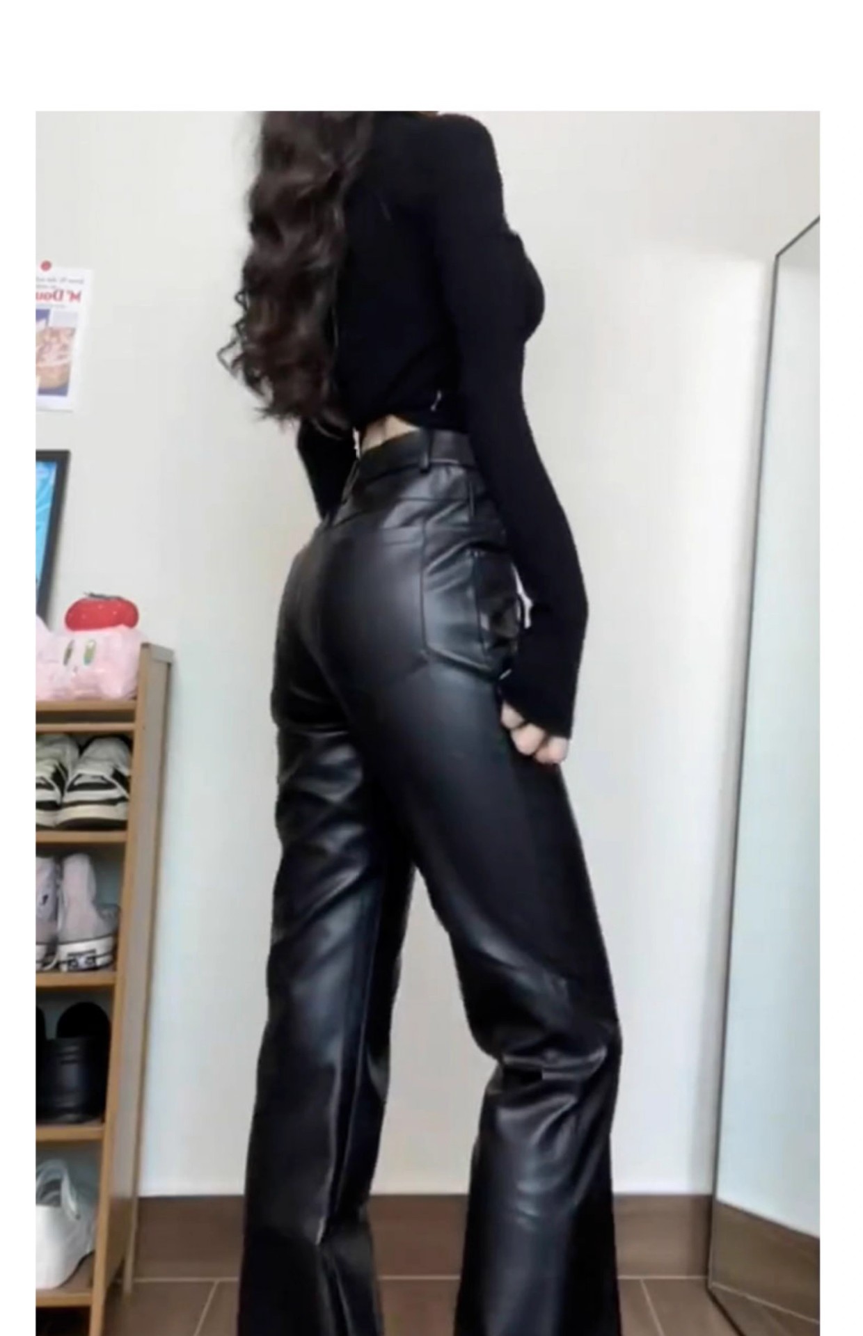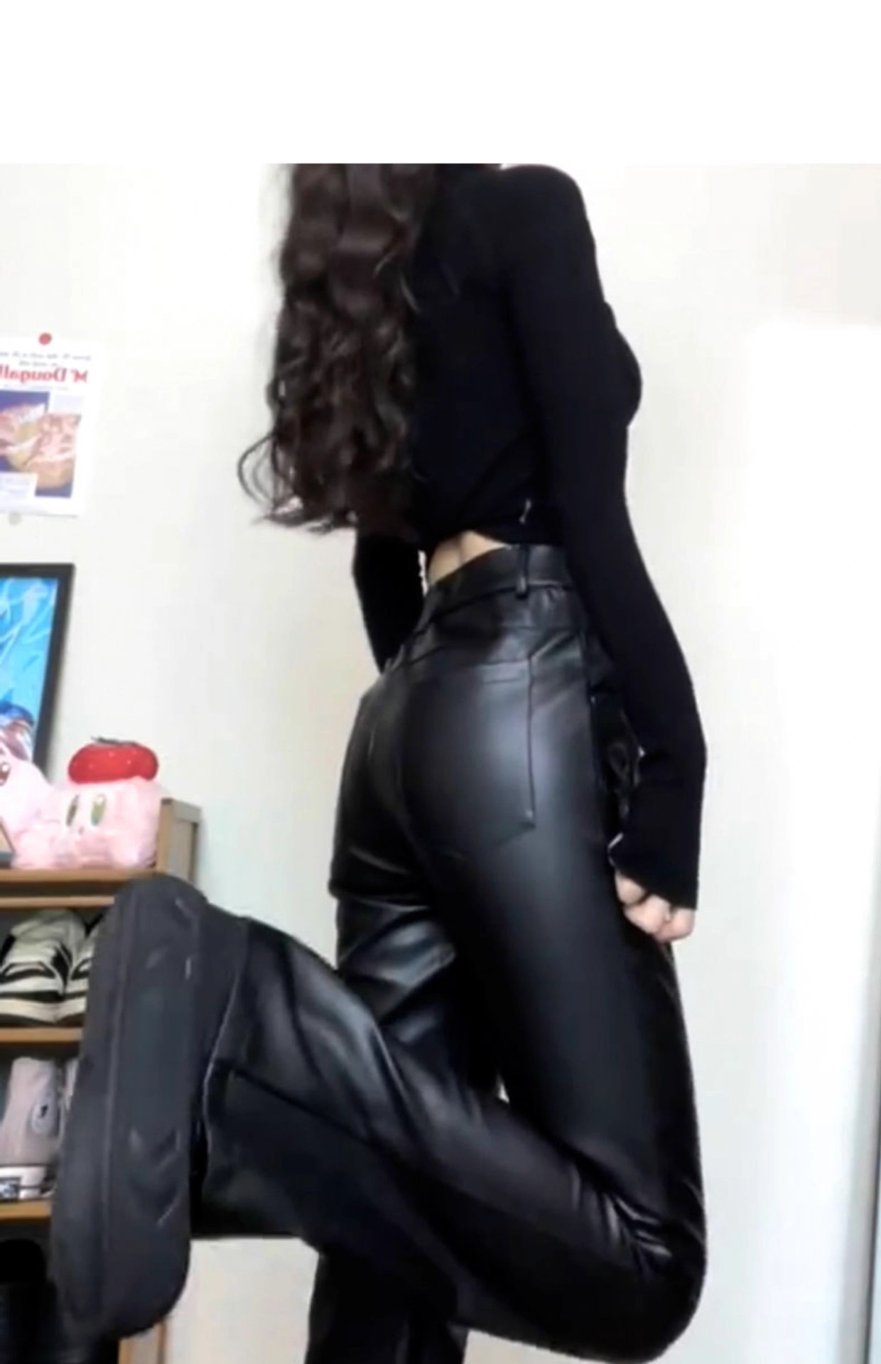 黒いギャルの小さいラッパのpuの皮のズボンの女性の春と秋の2025の新型はやせています。