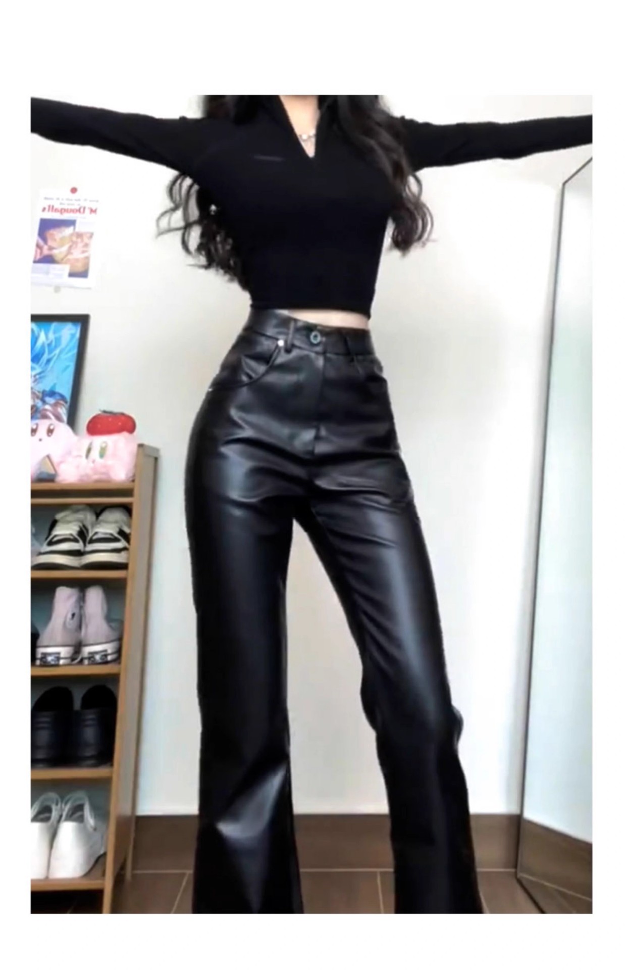 2025秋春夏新作レディースブラックpu皮カジュアルパンツハイウエストで痩せています。