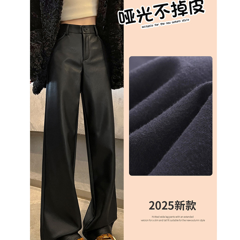 黑色皮裤阔腿裤女春秋季2025新款直筒窄版高级感高腰pu蛋白皮裤子