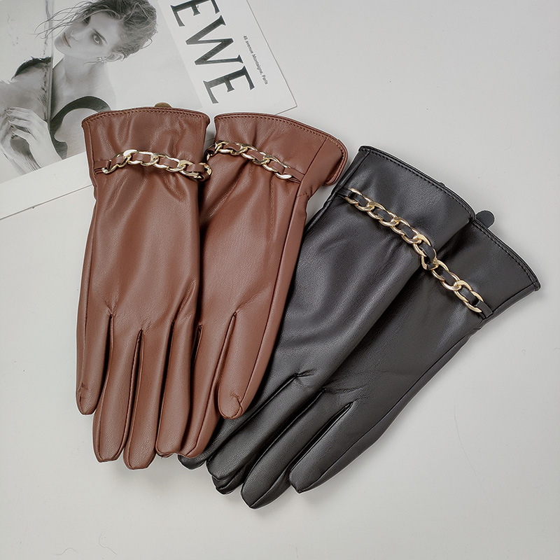 ファッション模造本革レディースpu皮手袋クラブdsダンスショー写真撮影cos金属チェーンベルベット保温