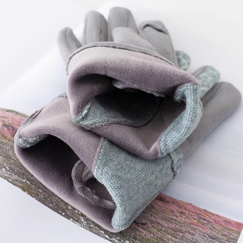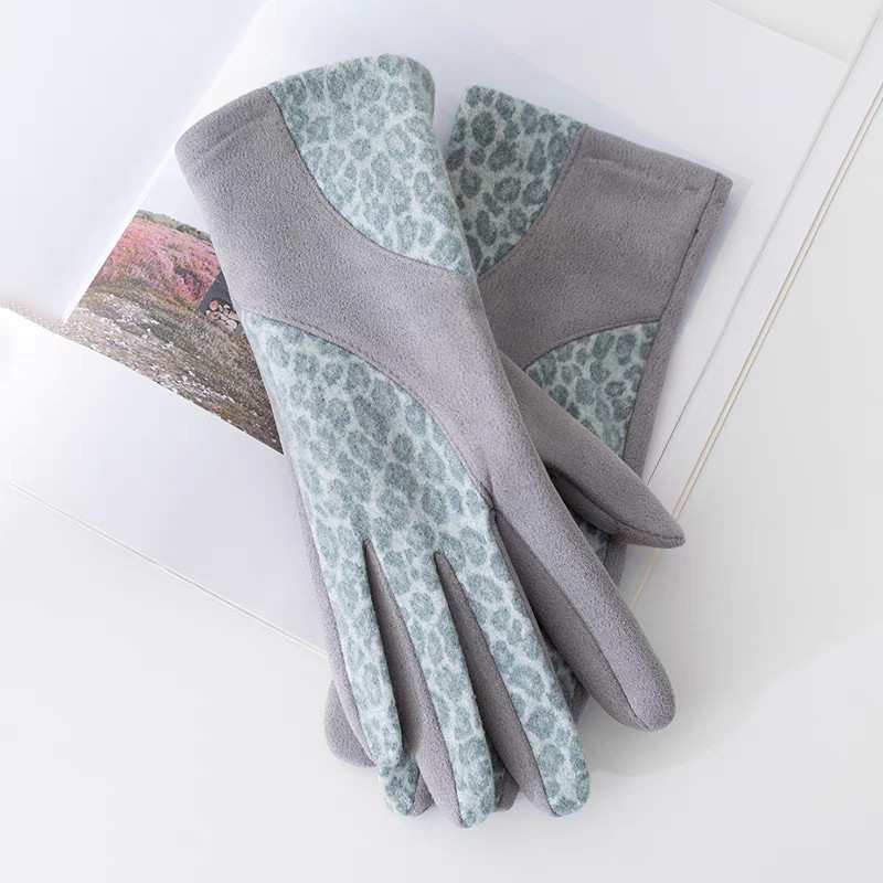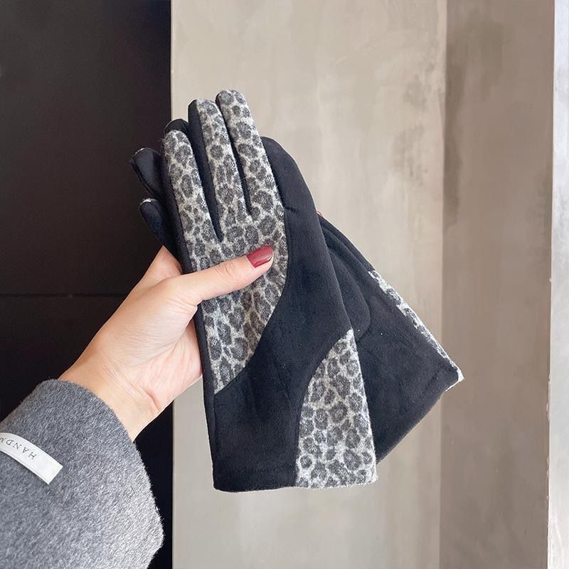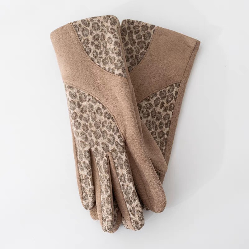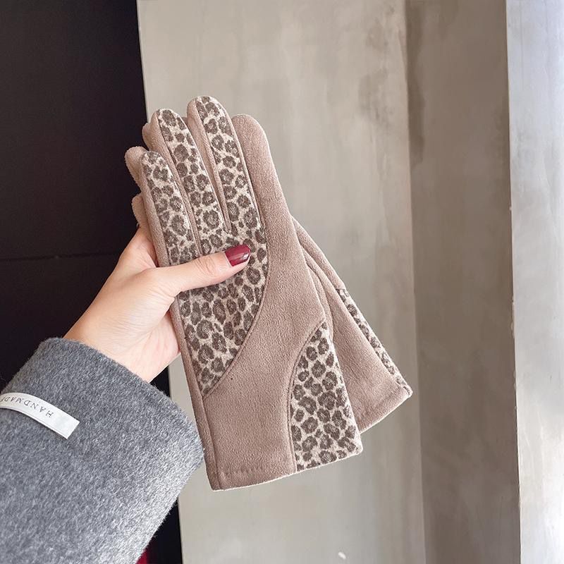 日系豹纹麂皮绒女士手套中厚款保暖防寒冬季开车骑车加绒时尚手套