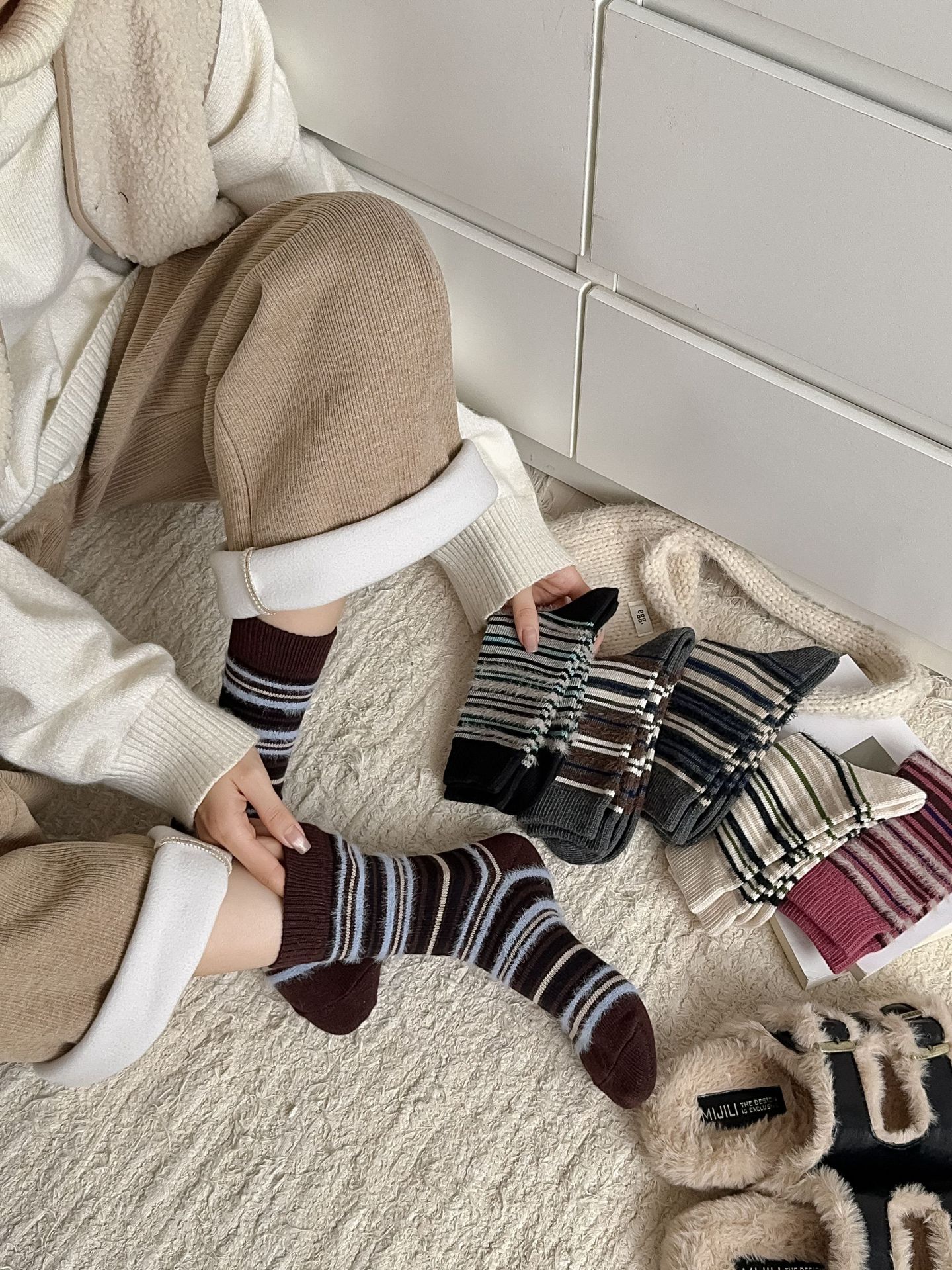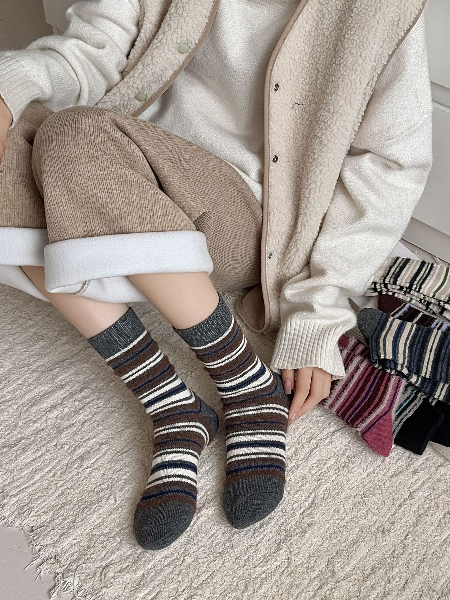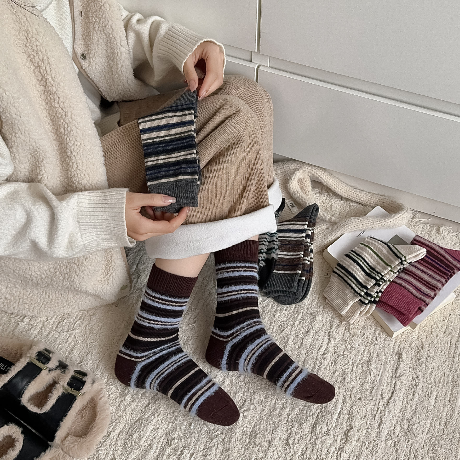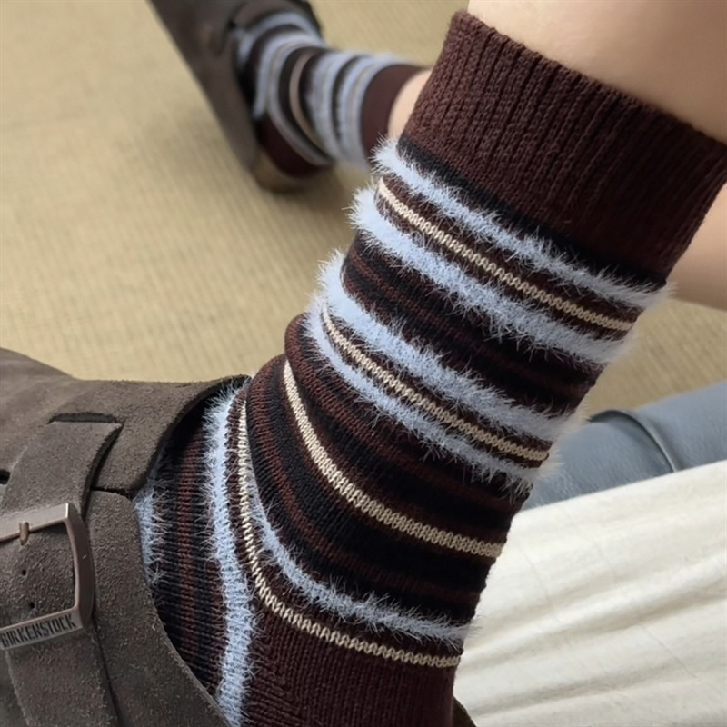 ins复古摩卡撞色条纹袜子女~韩系拼色貂绒中筒袜秋冬保暖堆堆袜!