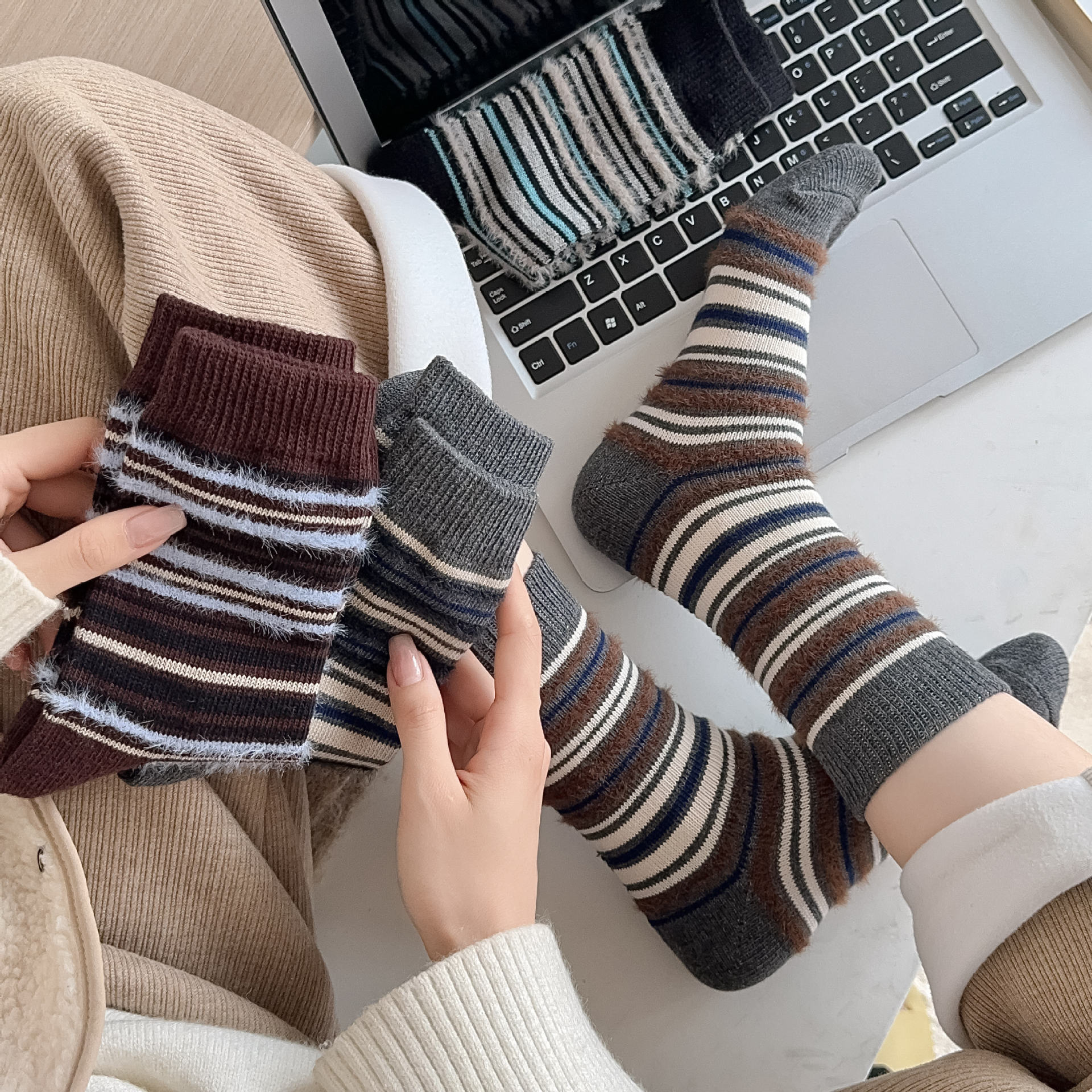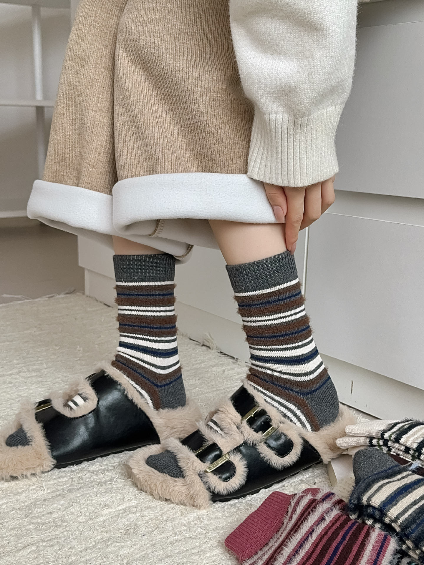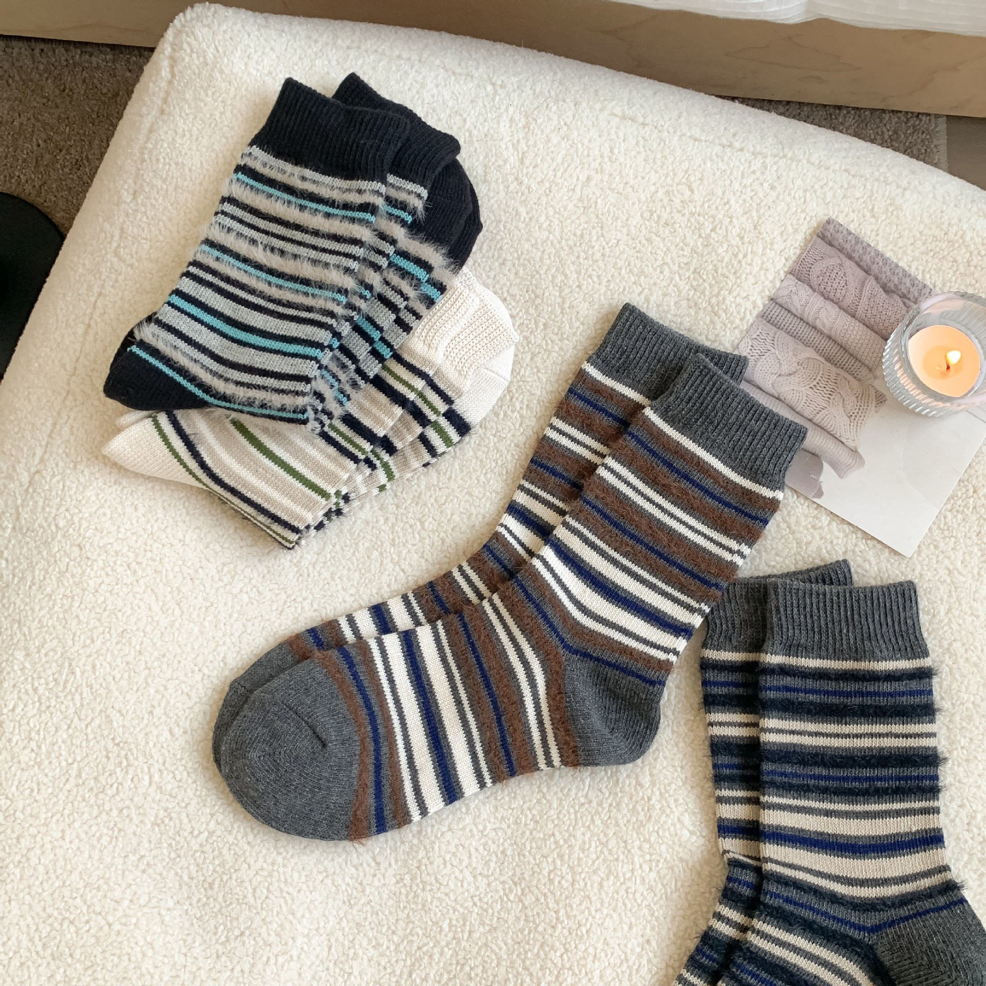 ins复古摩卡撞色条纹袜子女~韩系拼色貂绒中筒袜秋冬保暖堆堆袜!