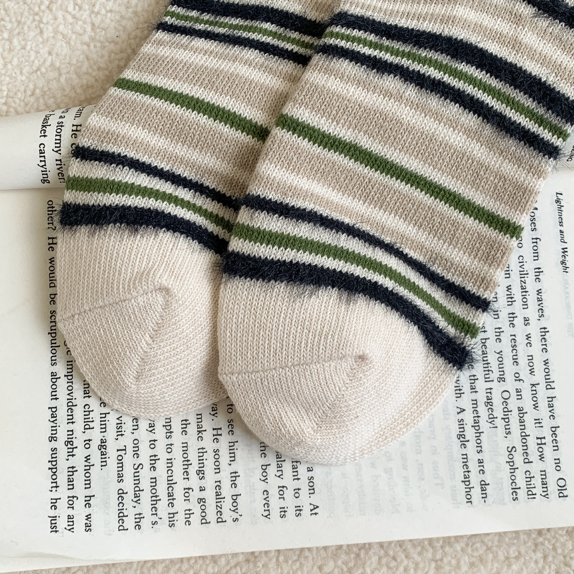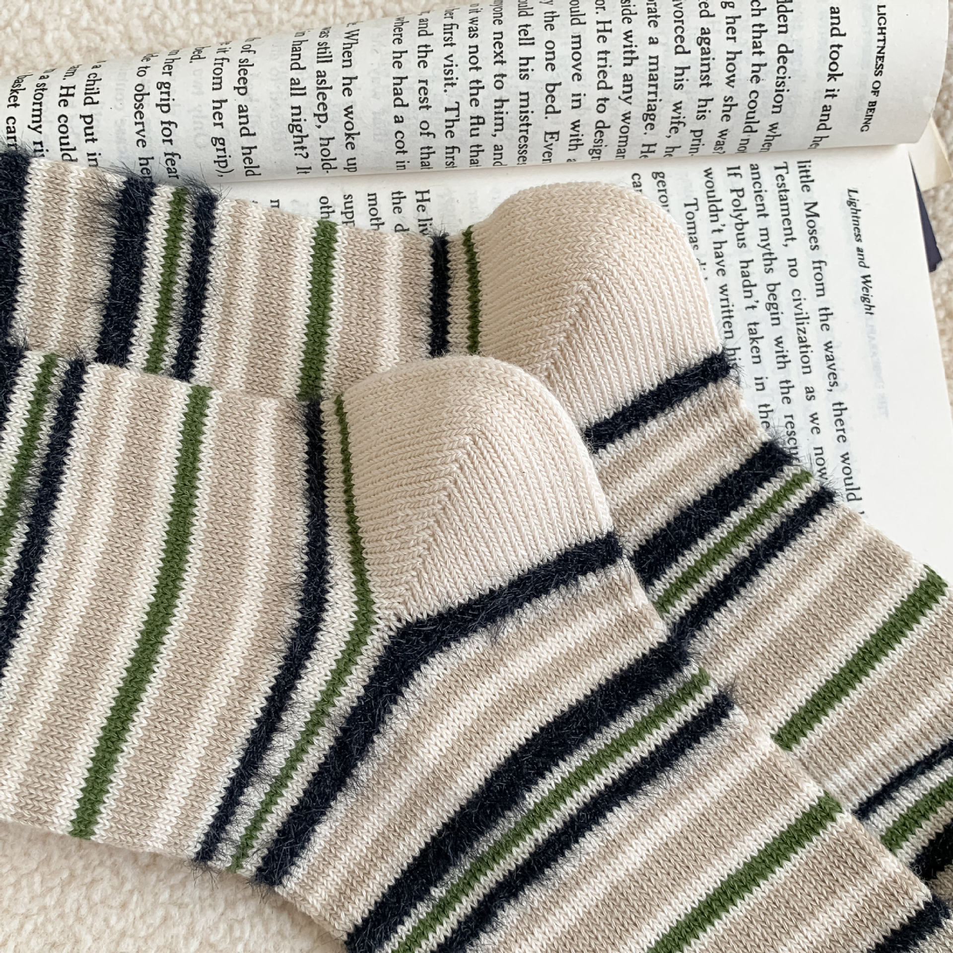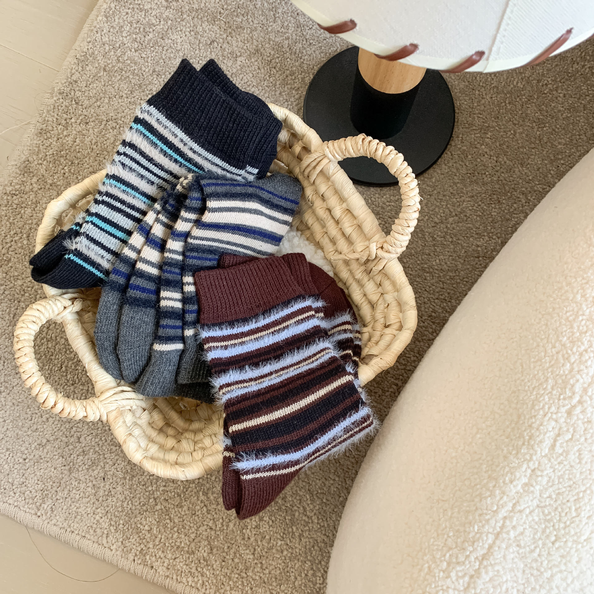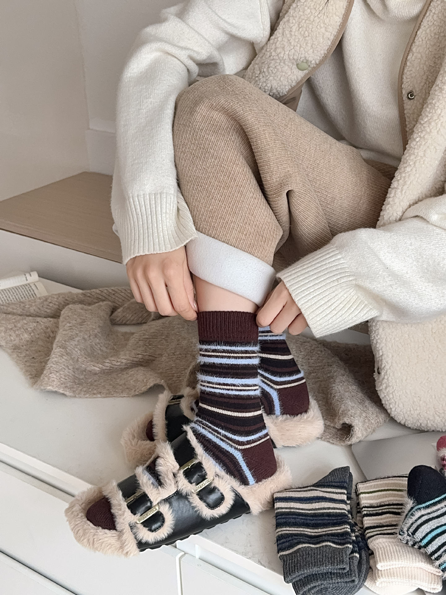 ins复古摩卡撞色条纹袜子女~韩系拼色貂绒中筒袜秋冬保暖堆堆袜!