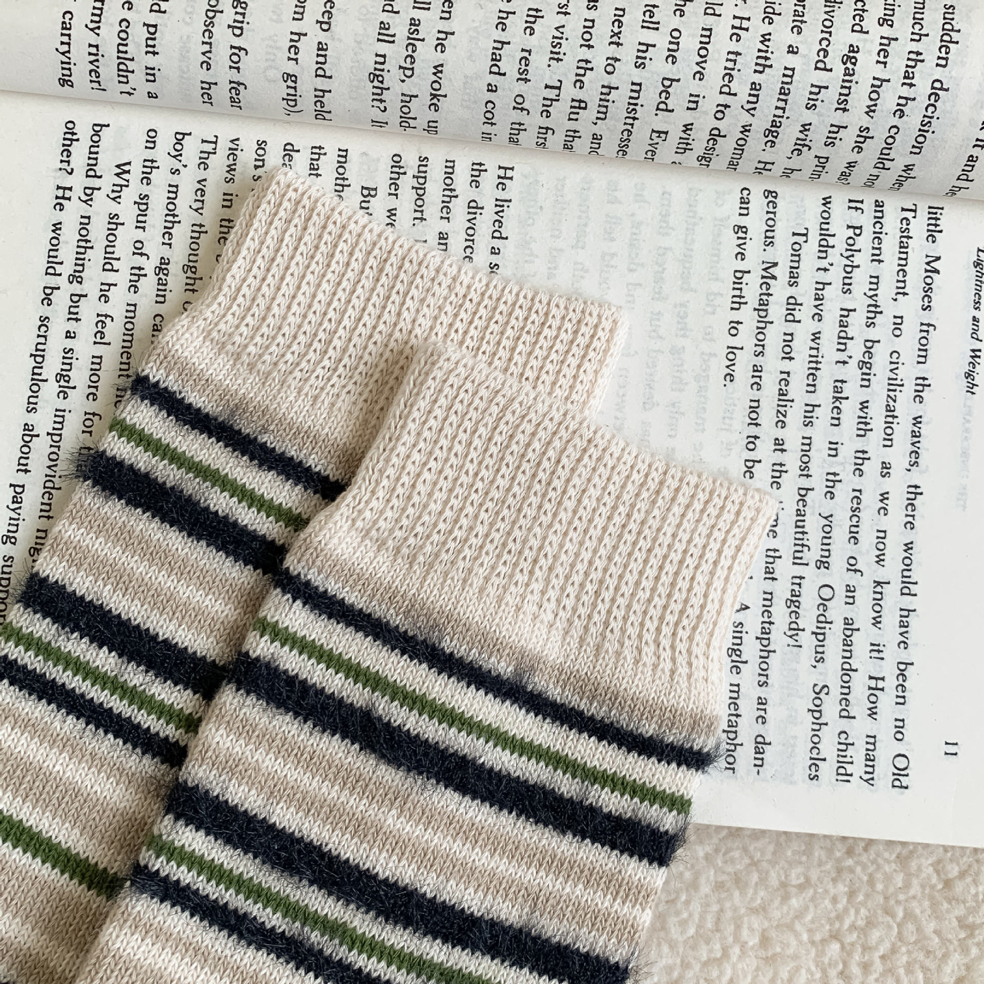 日本の純色のコンビネーションの縦縞の靴下の女性のins風の夏の薄いタイプのシンプルなコンビネーションの白い巻きの縁の積み重ねの靴下