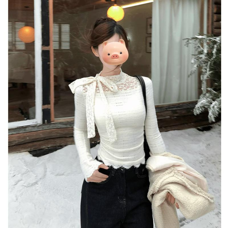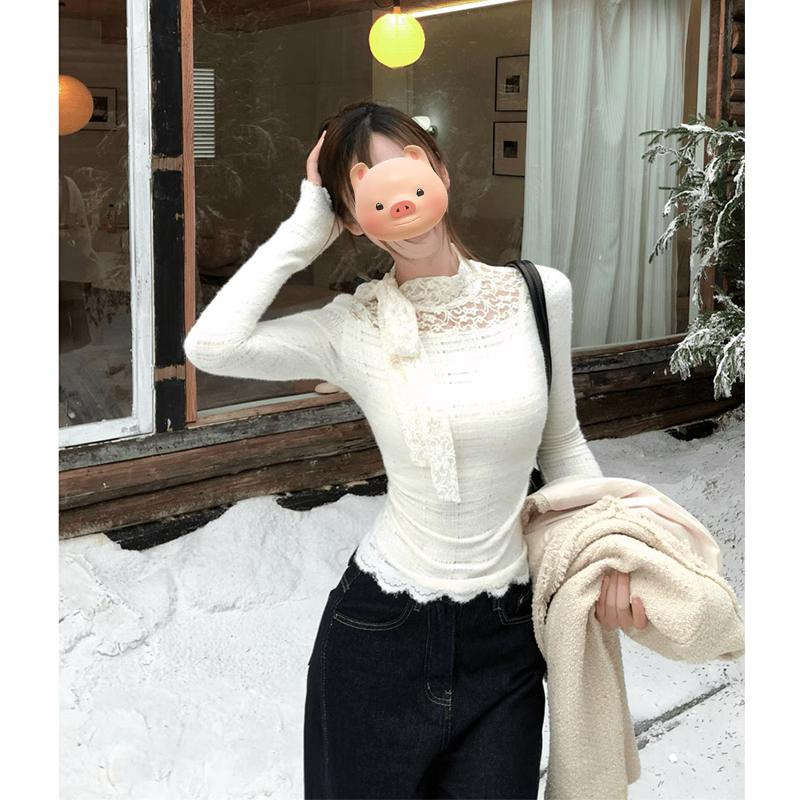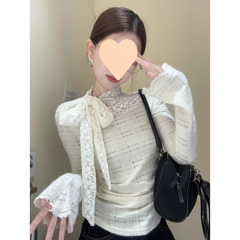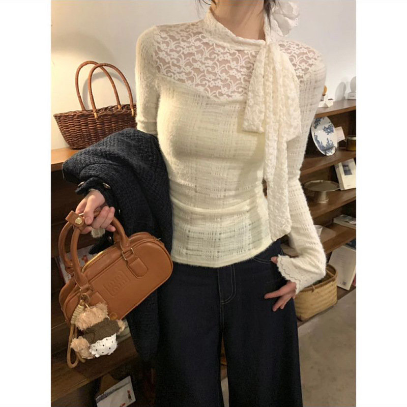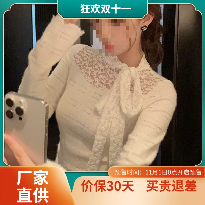 蕾丝打底 秋冬设计感纯欲蝴蝶结飘带蕾丝打底衫内搭女