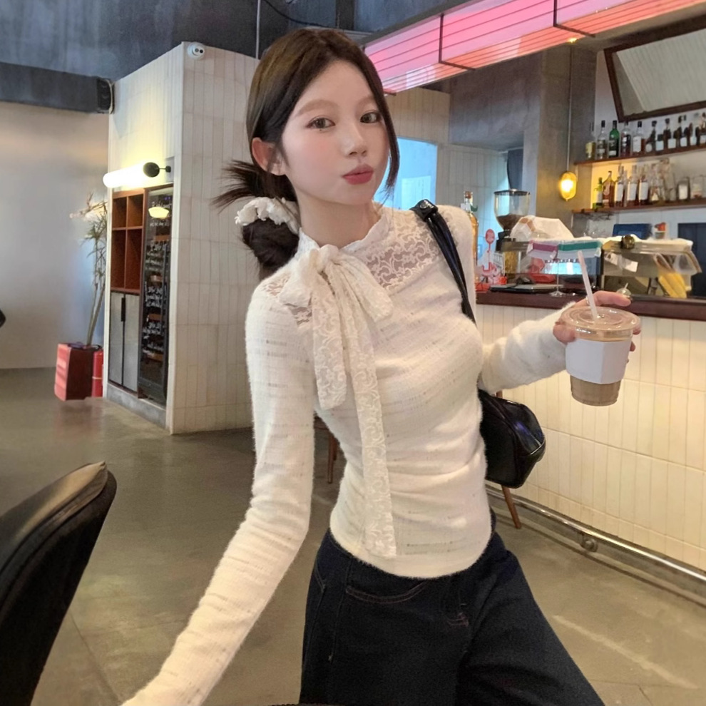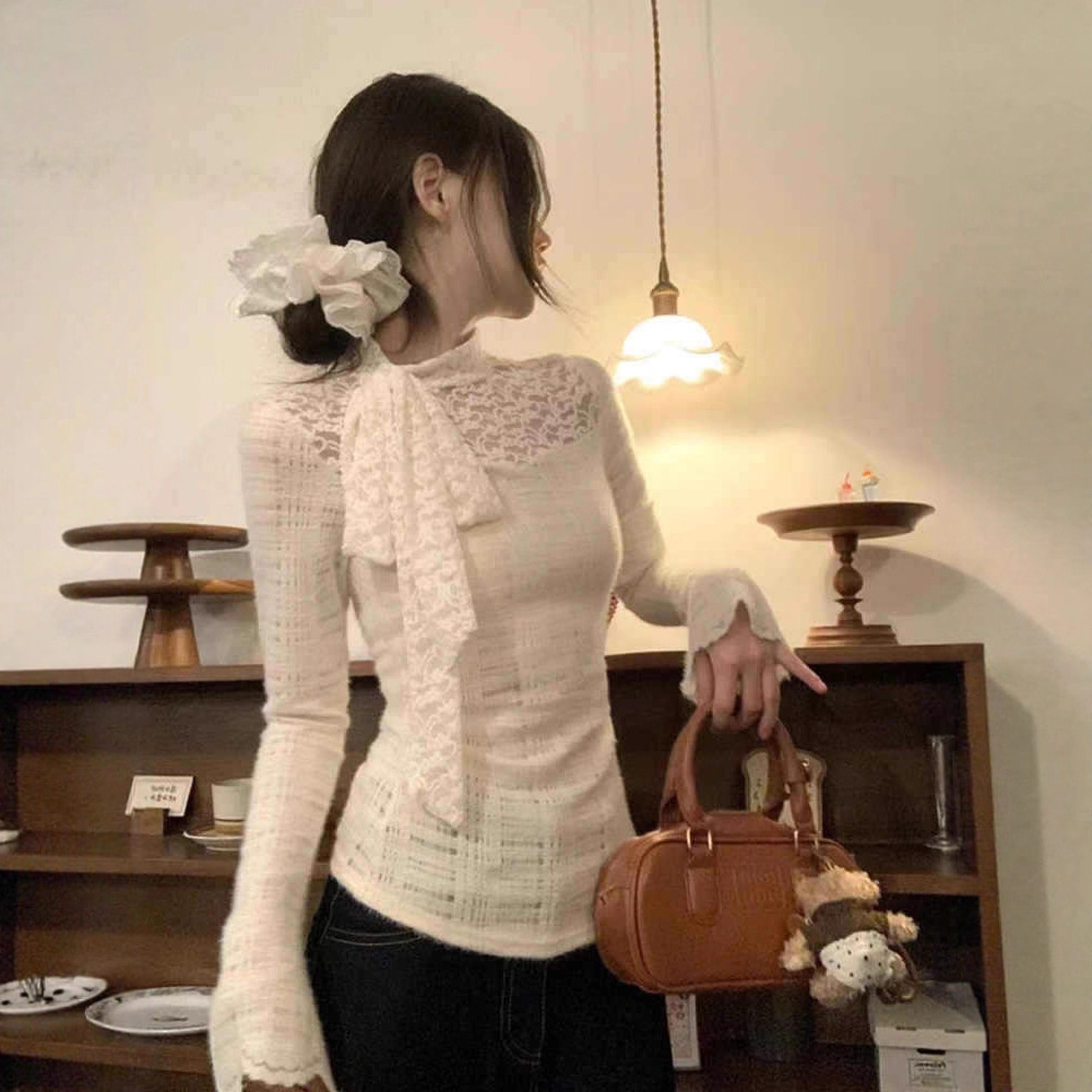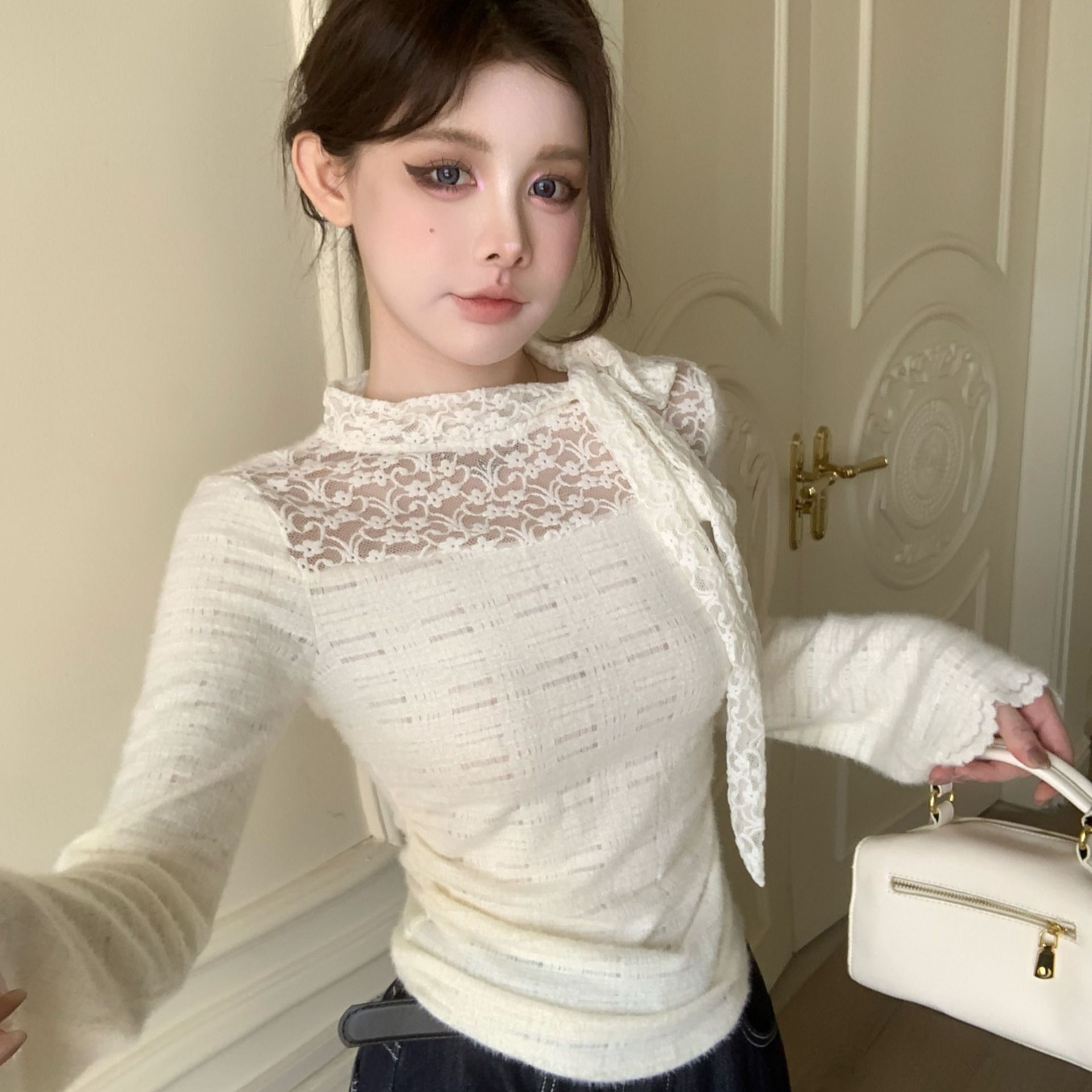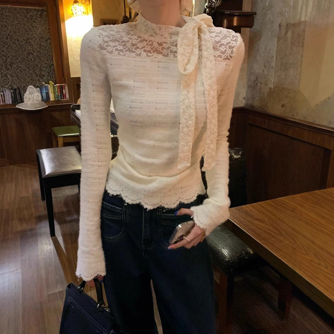 蕾丝打底 秋冬设计感纯欲蝴蝶结飘带蕾丝打底衫内搭女