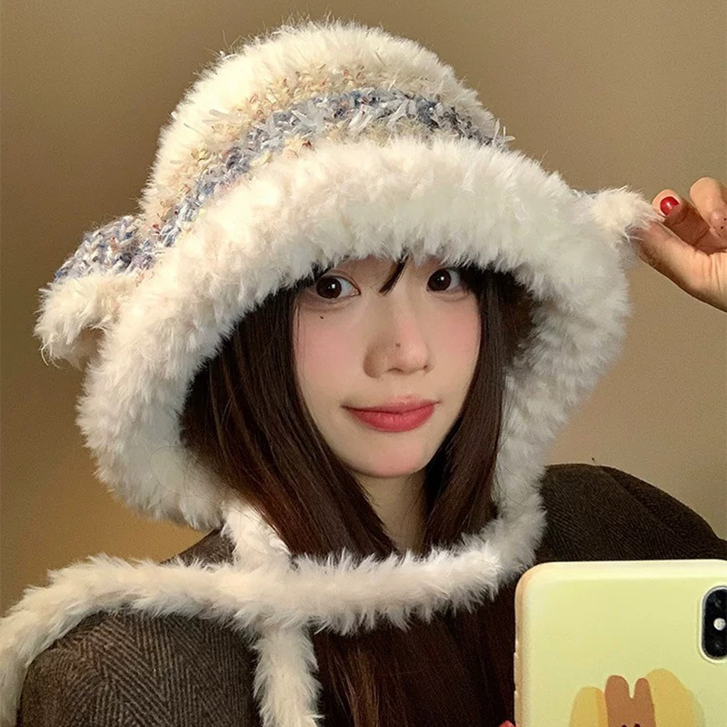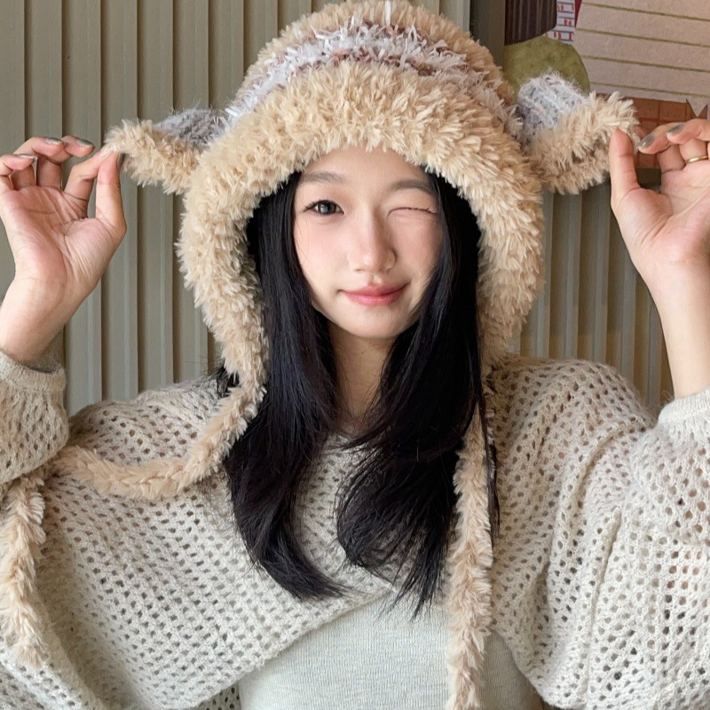 可爱小羊耳朵毛绒帽子女冬季大头围百搭针织帽骑车保暖护耳雷锋帽