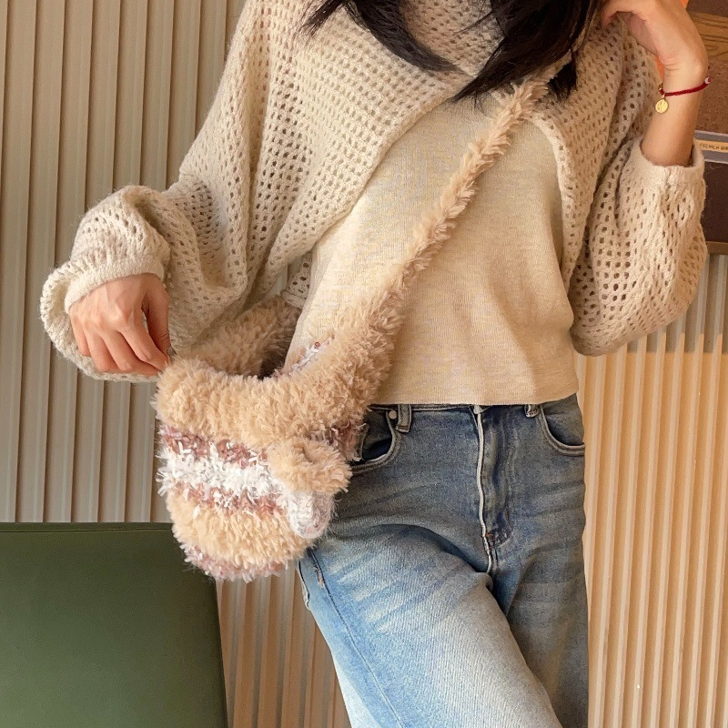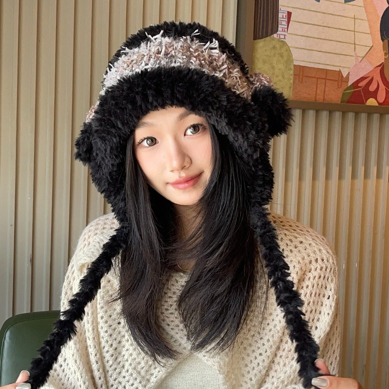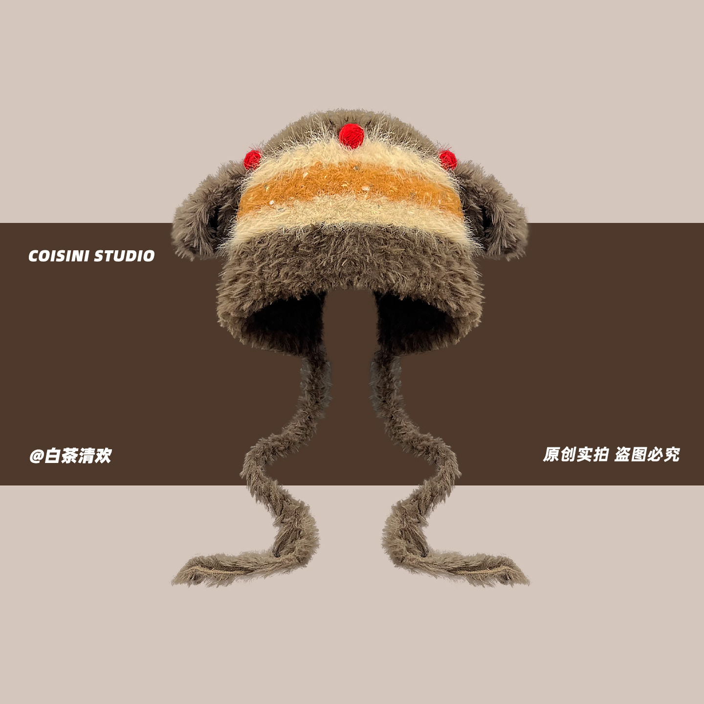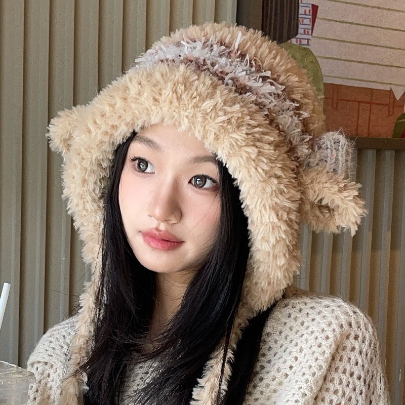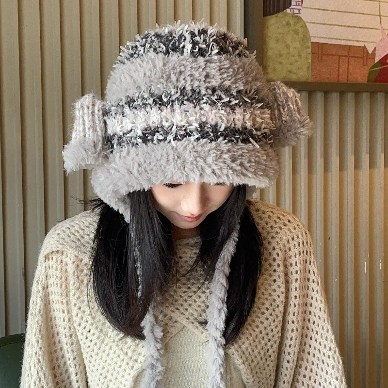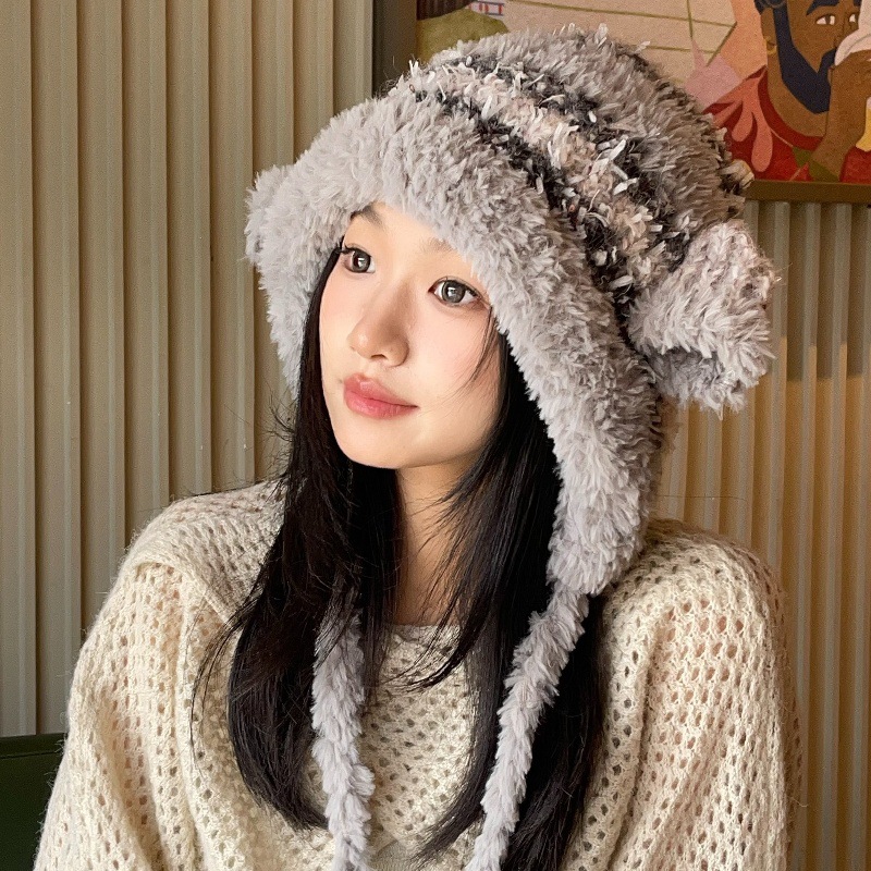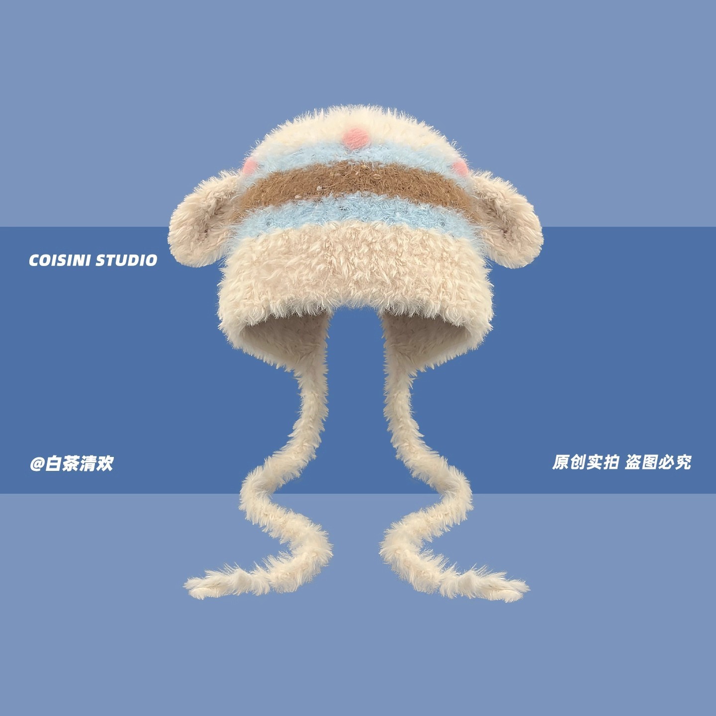 冬季保暖日系可爱小羊耳朵毛绒条纹针织帽子女秋冬辫子护耳毛线帽