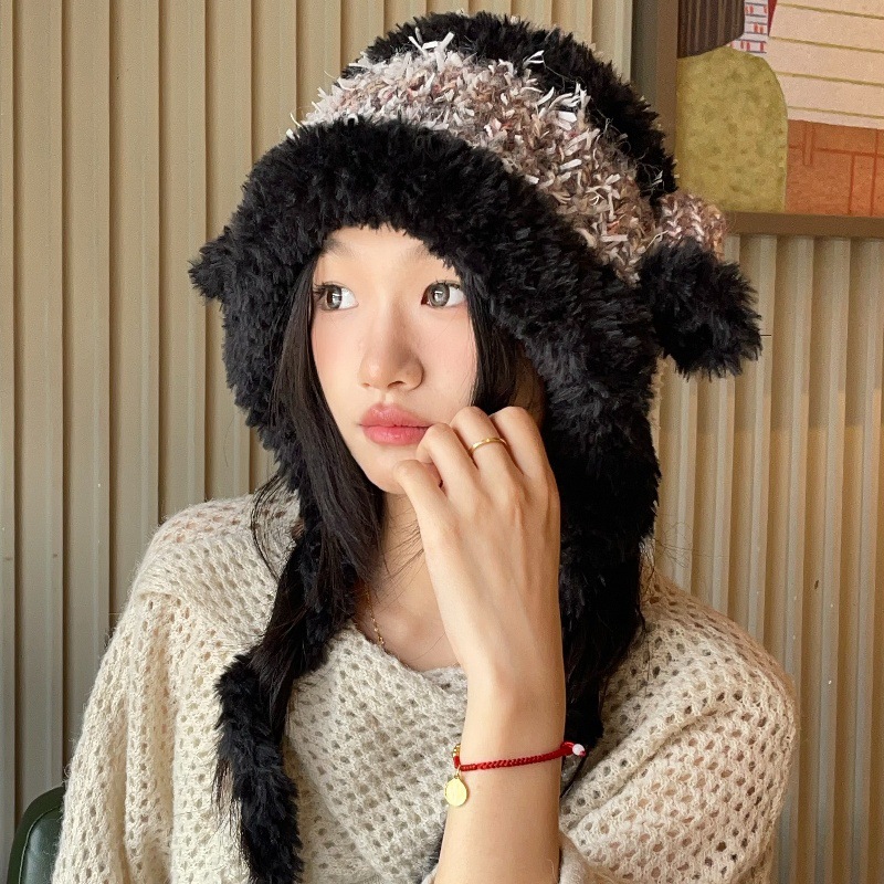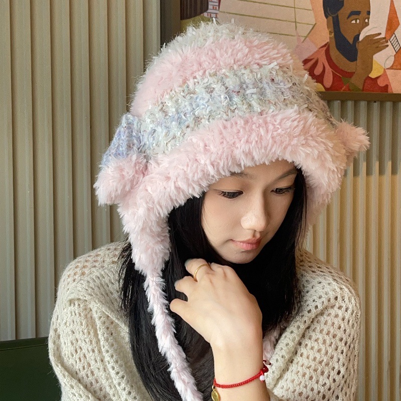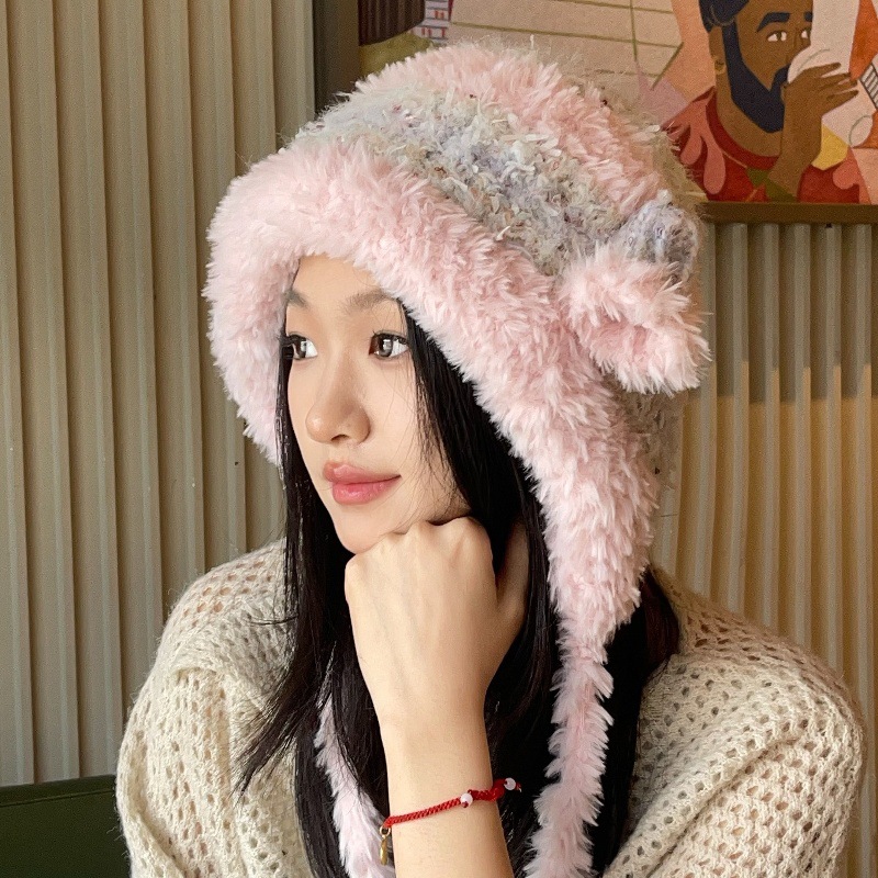 韩系可爱小羊耳朵毛绒帽保暖针织帽子女秋冬护耳雷锋帽辫子毛线帽