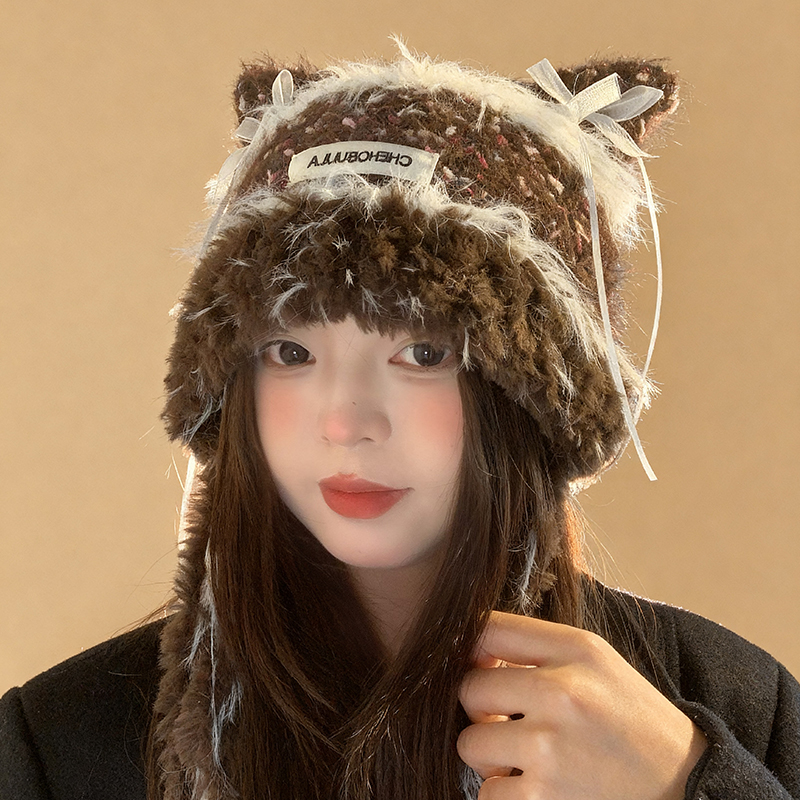 蝴蝶结可爱猫耳朵毛绒帽女秋冬季防寒保暖针织护耳帽流苏针织帽子