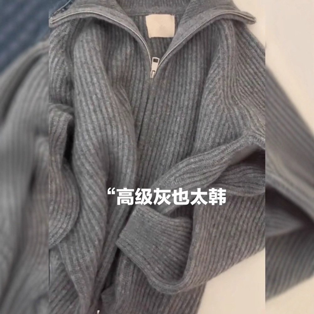 秋冬季大码高领拉链针织开衫宽松胖慵懒风设计感翻领毛衣外套女