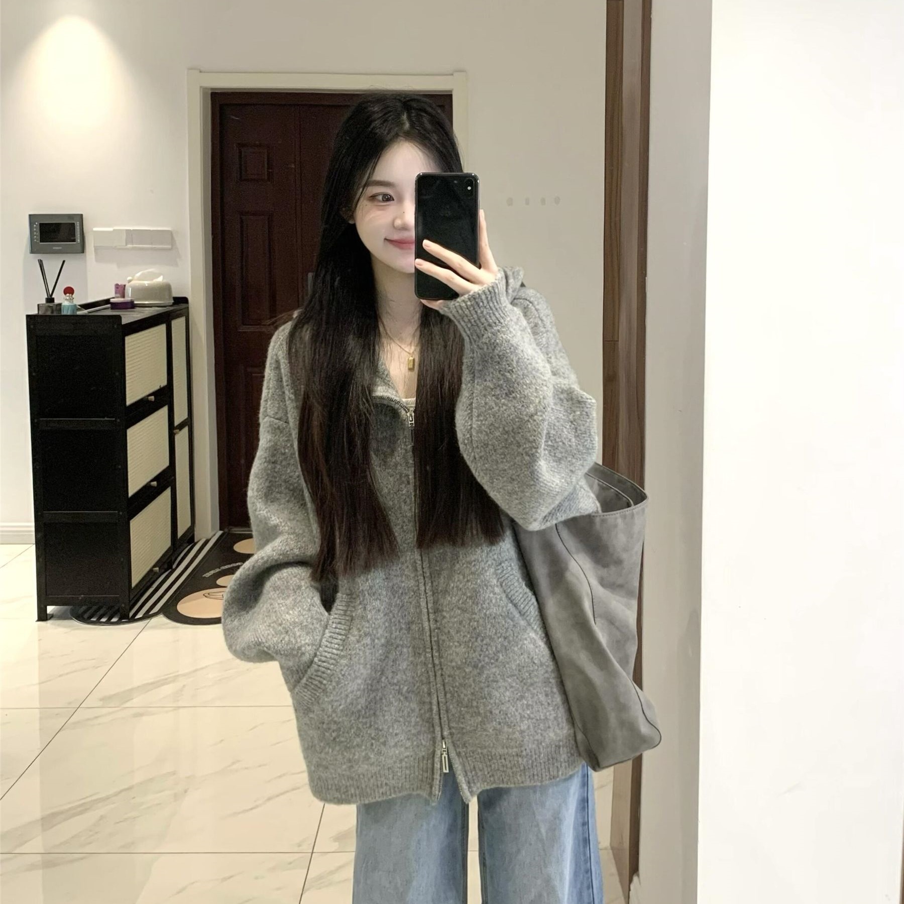 连帽针织毛衣开衫外套女针织衫慵懒感纯色新款韩系秋冬季穿搭