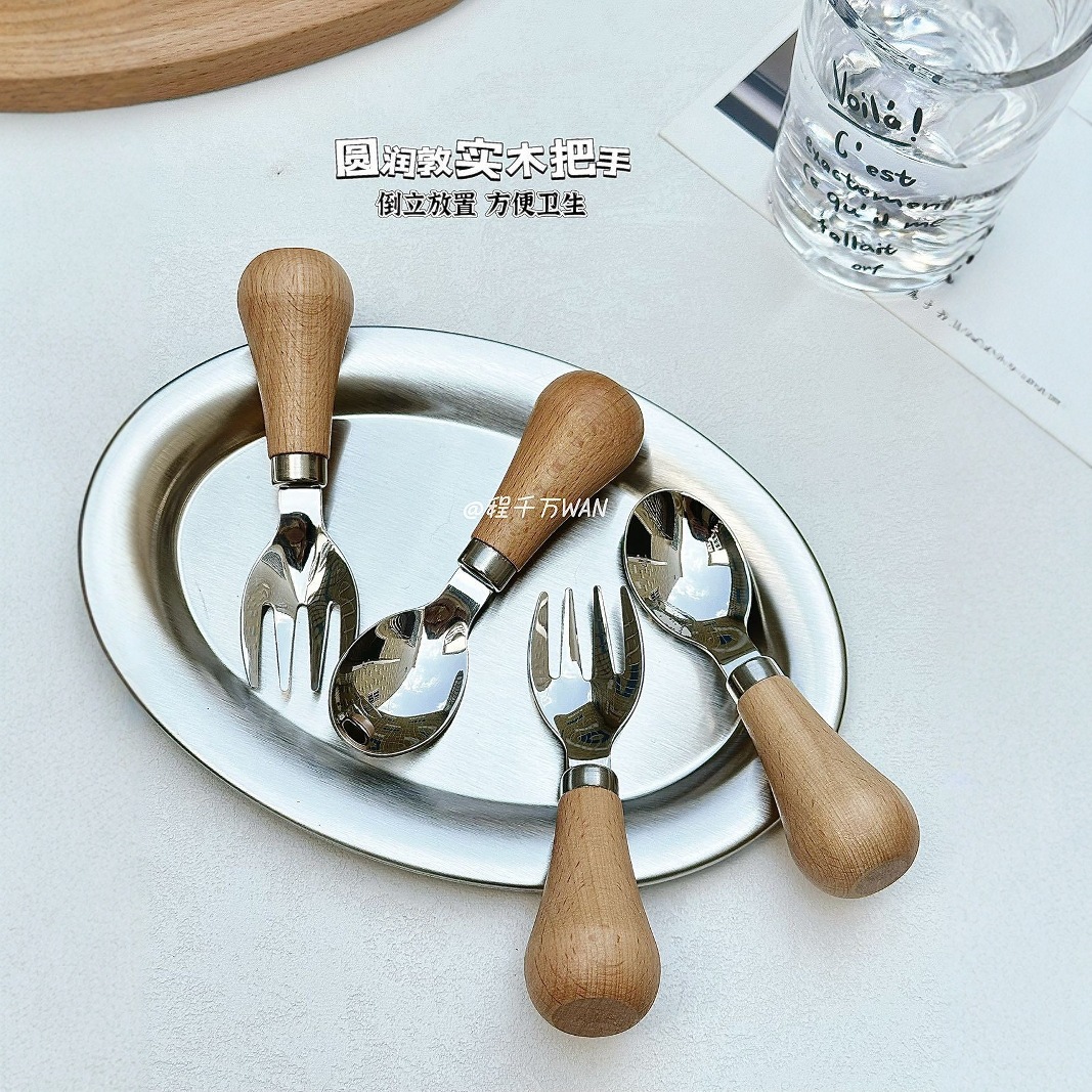304ステンレスショートソリッドウッド柄子供スプーンフォーク縦型カトラリーセット可爱いインスタ风赤ちゃんカトラリー