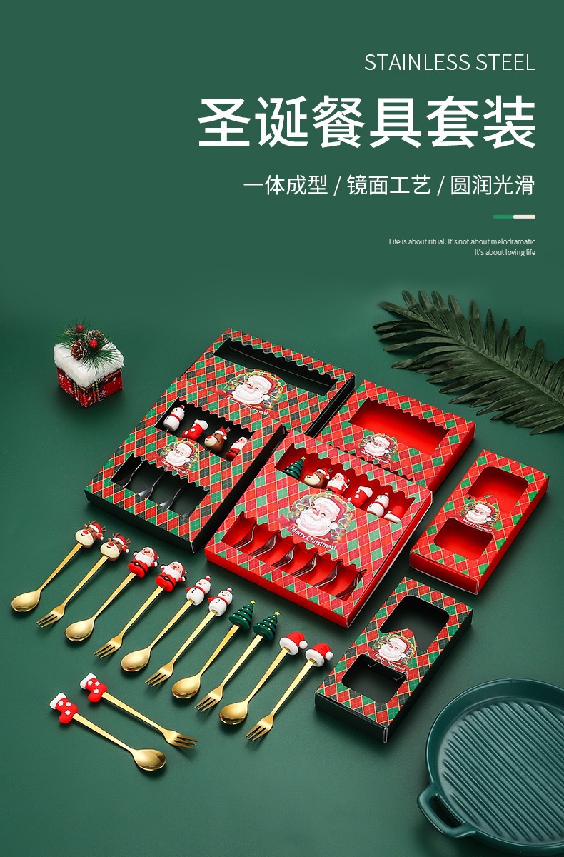 跨境卡通圣诞勺子套装圣诞老人圣诞树麋鹿勺叉礼盒餐具四件套