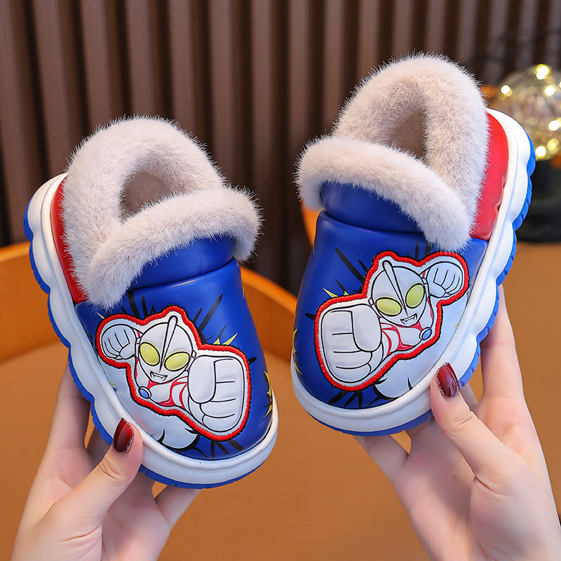ウルトラマン綿靴子供用男の子秋冬漫画柄ソフトソール室内外兼用PUレザーベビー綿スリッパ子供用