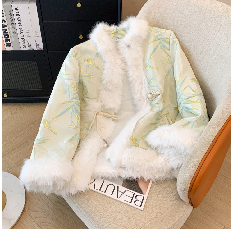 2025秋冬新款国风皮草外套新中式盘扣棉服女唐装刺绣仿狐狸毛外套