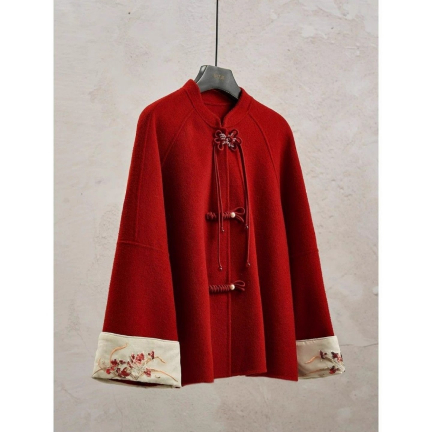 新しい中国式の赤い両面の毛は馬甲の女性の秋冬の新型の軽い国風の唐の装の馬は銅銭の皿を挟んで上着を掛けます。