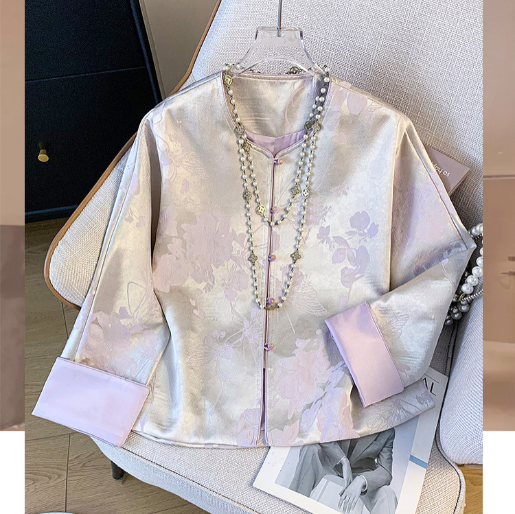 新中式重工提花拼接圆领缎面提花盘扣长袖复古改良民族风上衣女