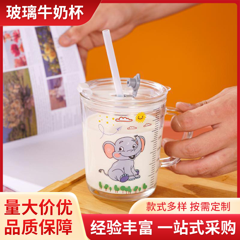ガラスミルクカップ子供用スケールカップ朝食用ミルクカップ漫画パターンストロー付きガラスカップ