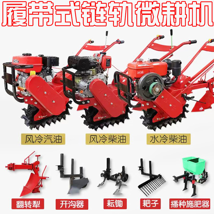 多功能链轨微耕机可条播小麦、黄豆、红豆、豌豆、玉米、蚕豆、牧草、药材等颗粒状种子,同时施肥、播种,下种量、下肥量、播种深度可以调节是旱田使用的小型机械。适用于所有旱田农作物垄间作业。是广大农民朋友实现农业机械化的产品。选配正规企业生产的变速箱,优质柴油/汽油机为配套动力。易启动,轻便耐用。整体板设计,一次成型,坚固耐用。加粗手把。人性化的优质手油门设计。新款增添了高低空档挂挡离合功能,独特的主轮设计不溜沟,扬尘少,减少变速箱漏土及缠草。