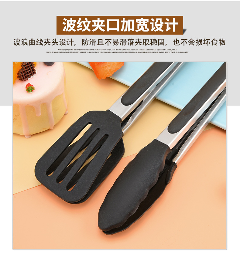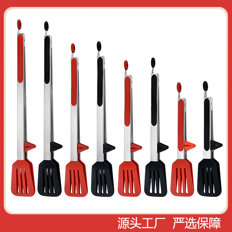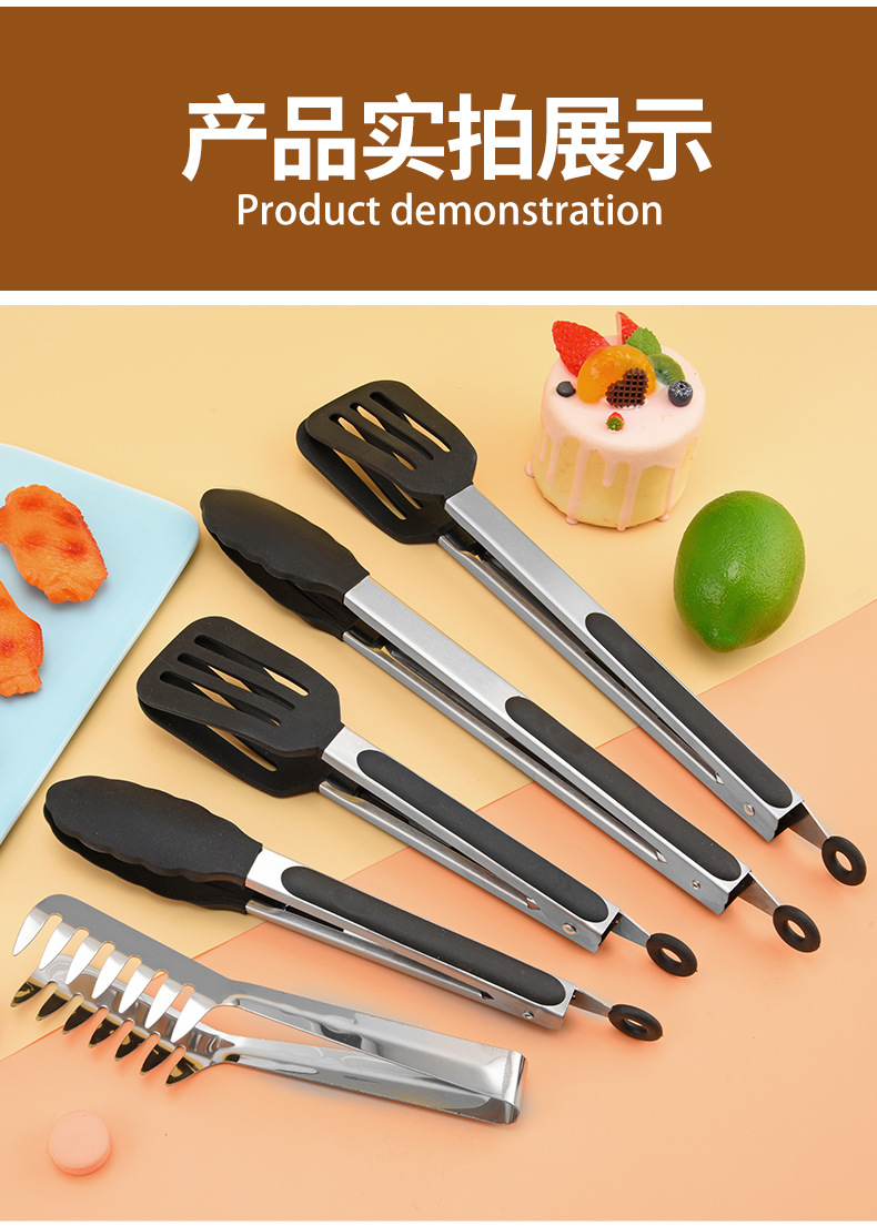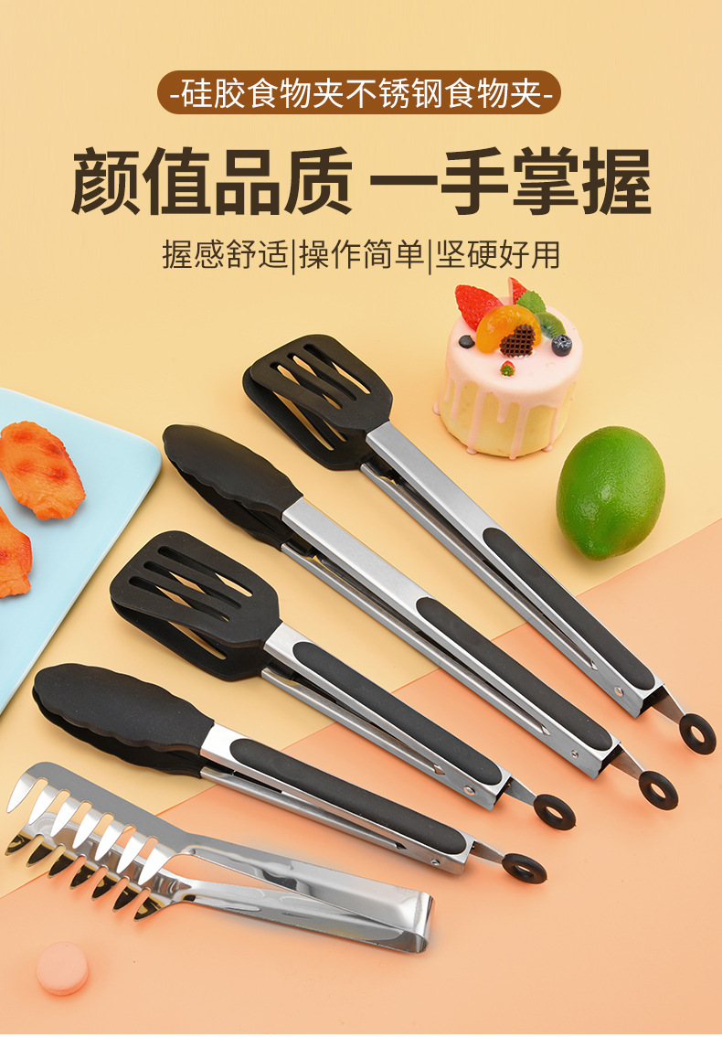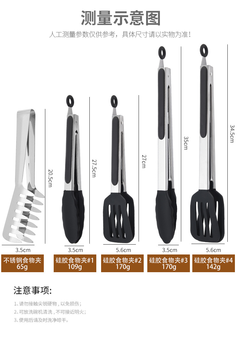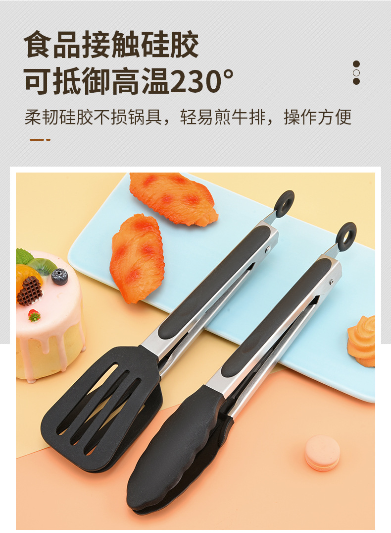 硅胶食物夹9寸12寸立式支架不锈钢耐高温牛排烤肉面包食物夹铲夹