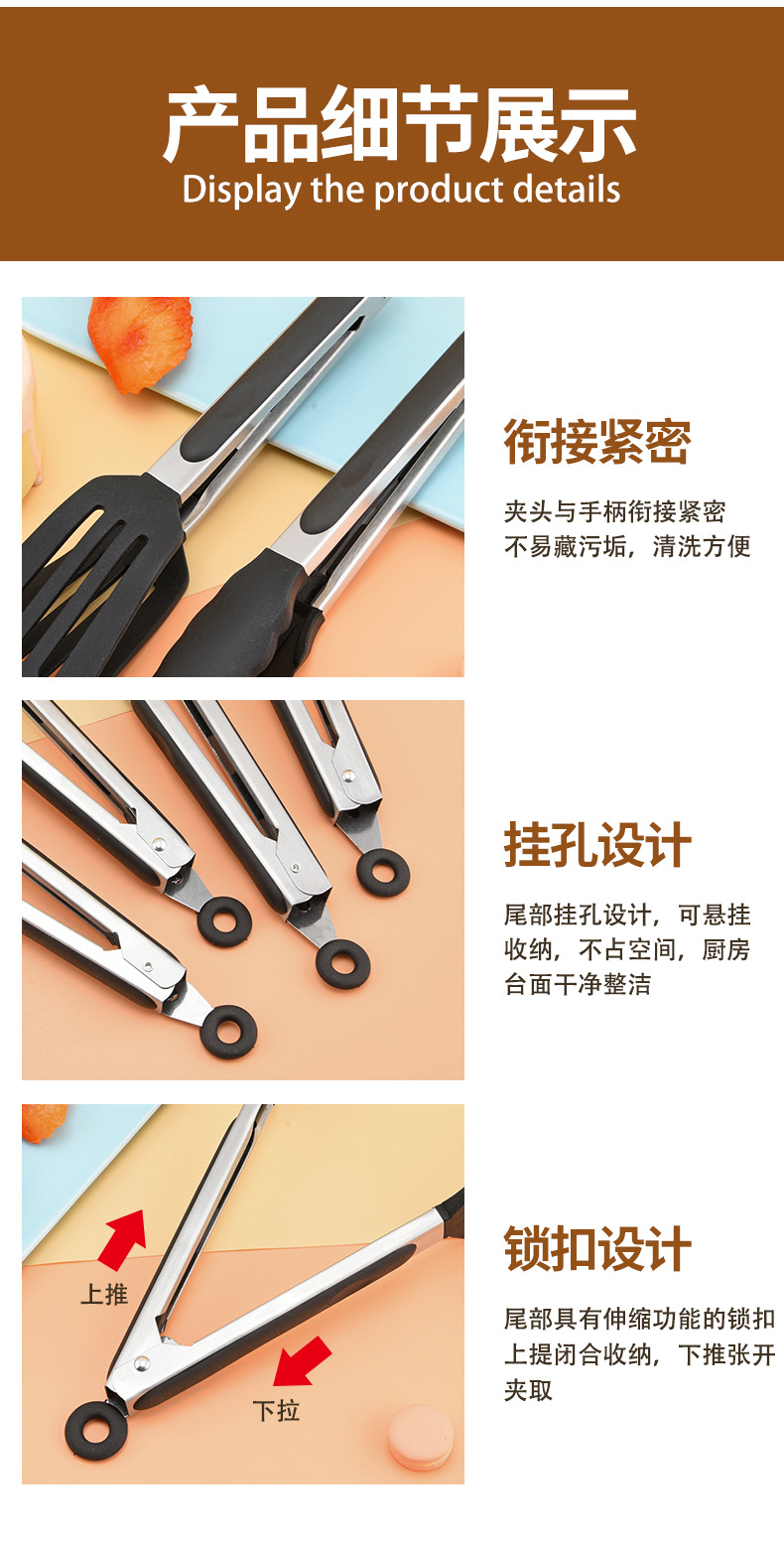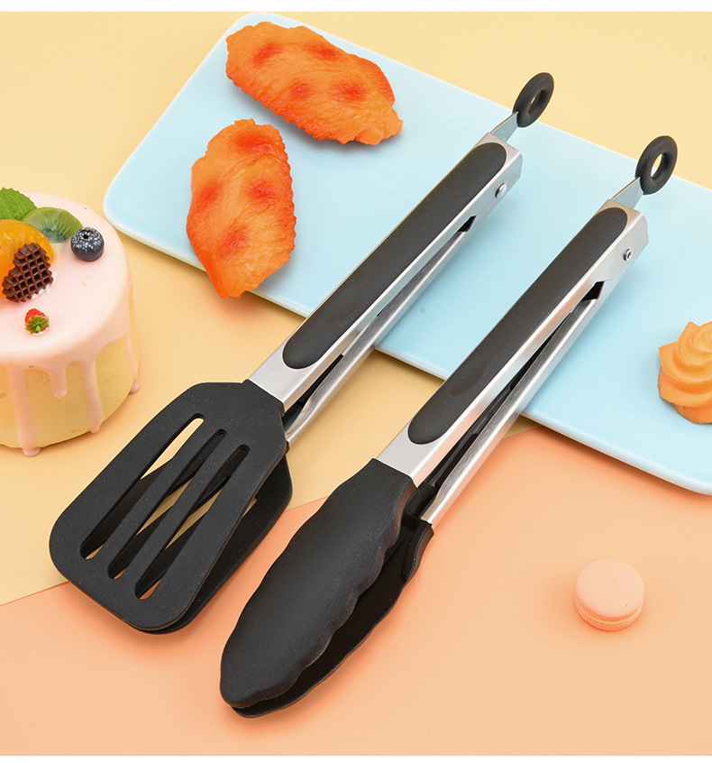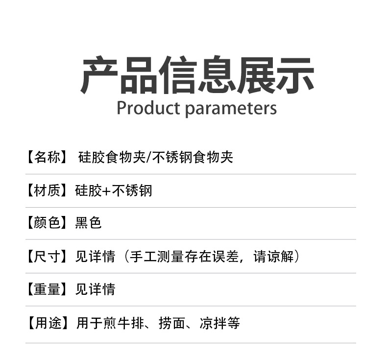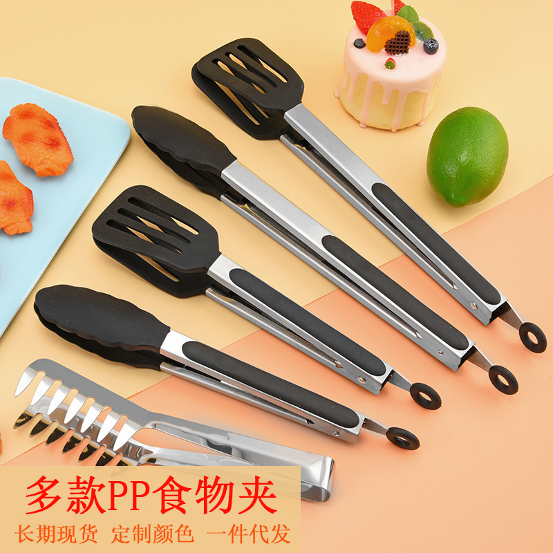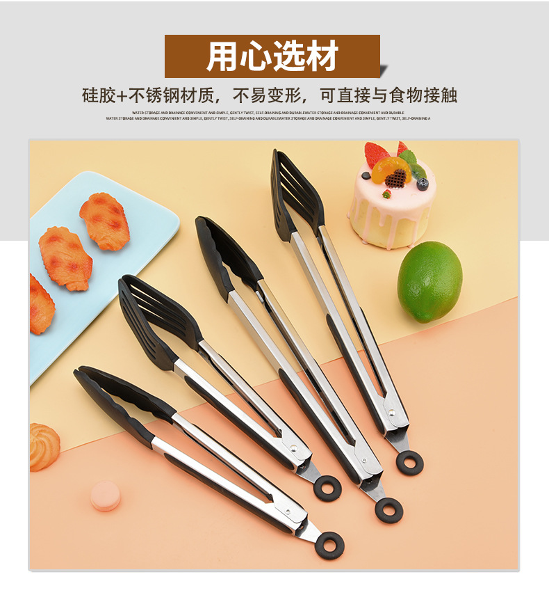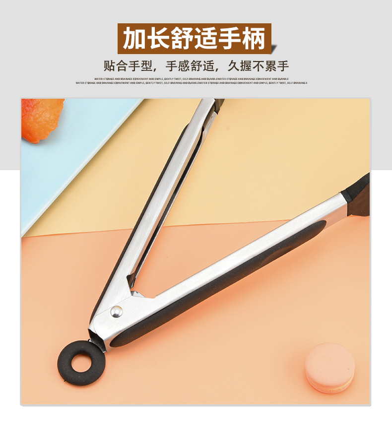 硅胶食物夹9寸12寸立式支架不锈钢耐高温牛排烤肉面包食物夹铲夹