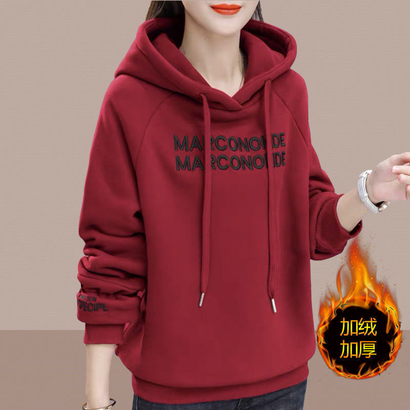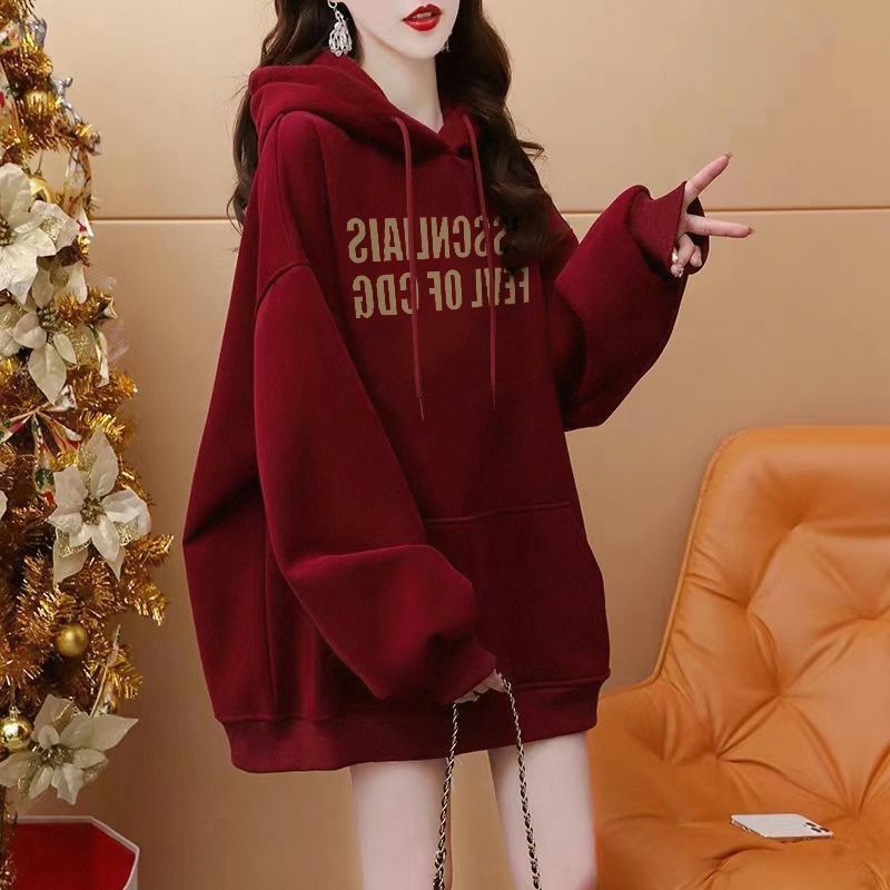 300斤中长款加绒加厚红色卫衣女2025秋冬宽松慵懒风保暖外套上衣