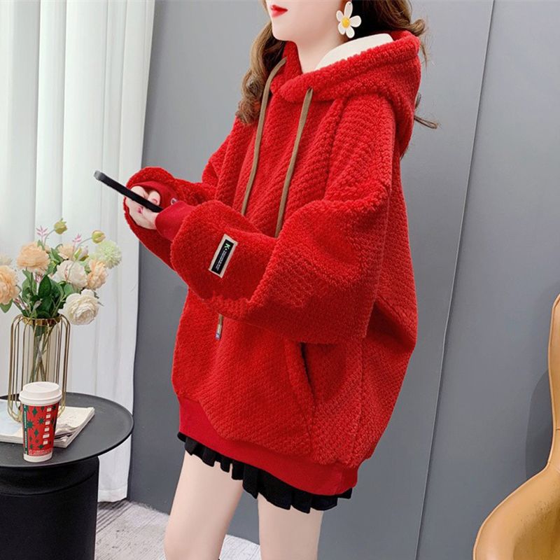 开门红羊羔毛加绒加厚保暖卫衣女大码韩版宽松红色本命上衣外套潮