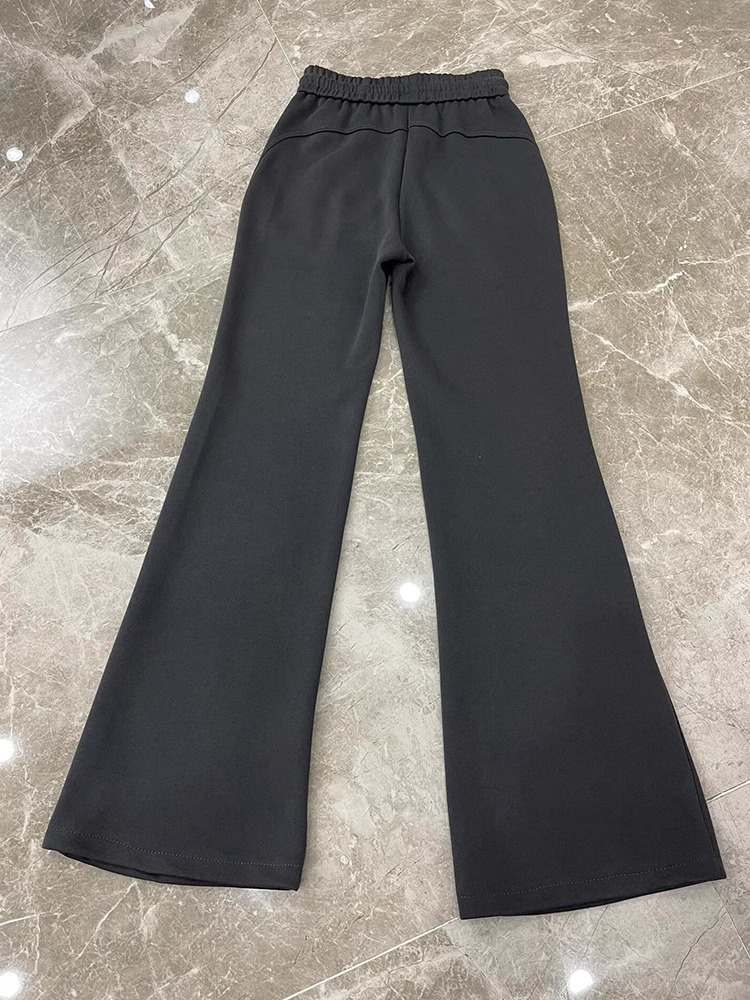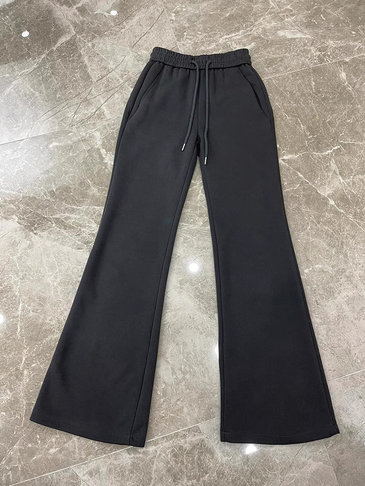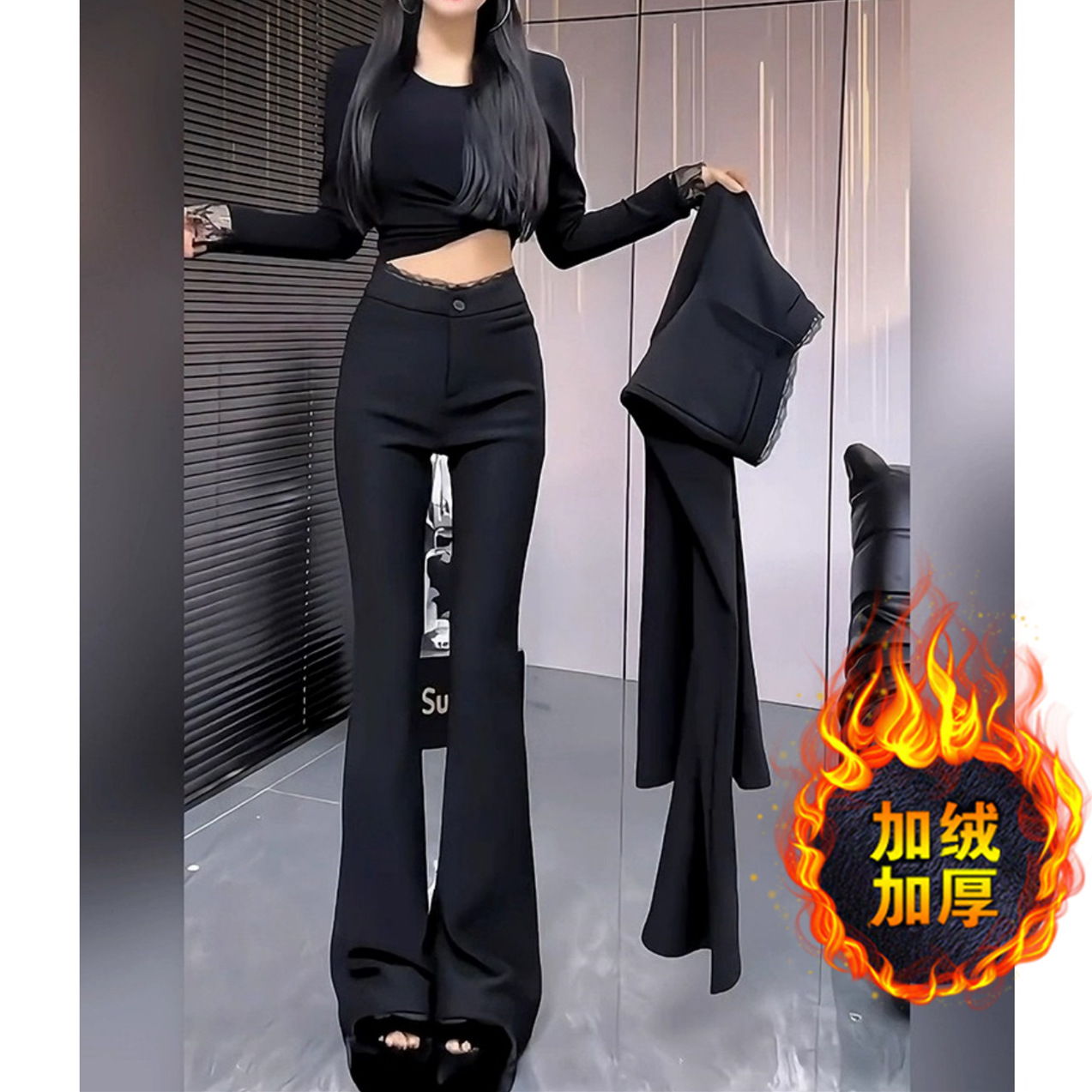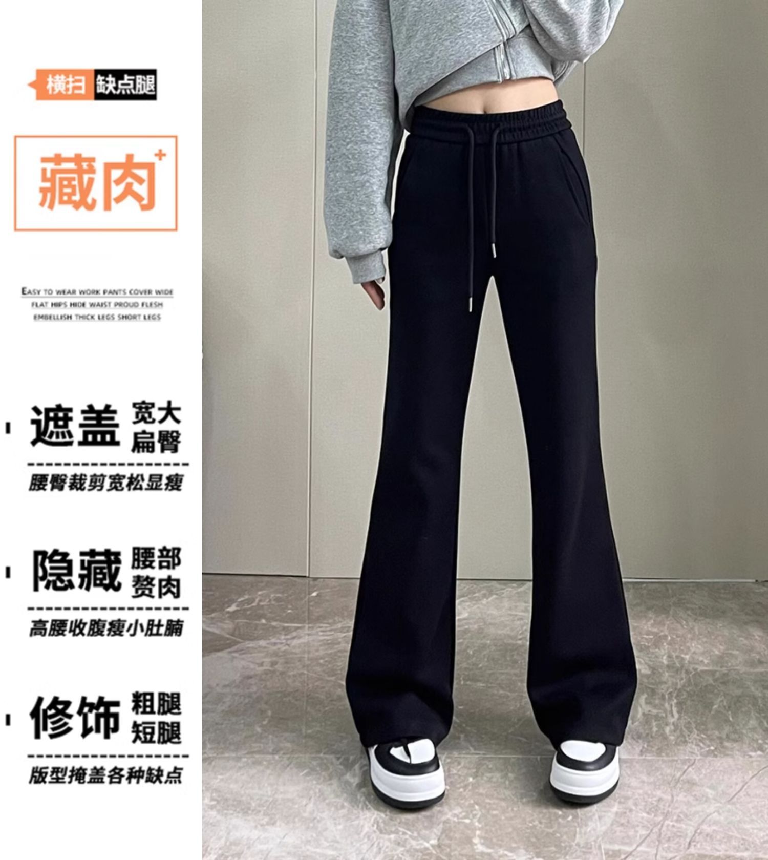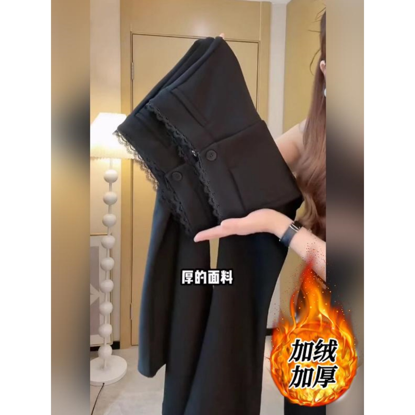 蕾丝边微喇休闲裤女秋冬加绒加厚大码胖mm显瘦梨型身材黑色喇叭裤