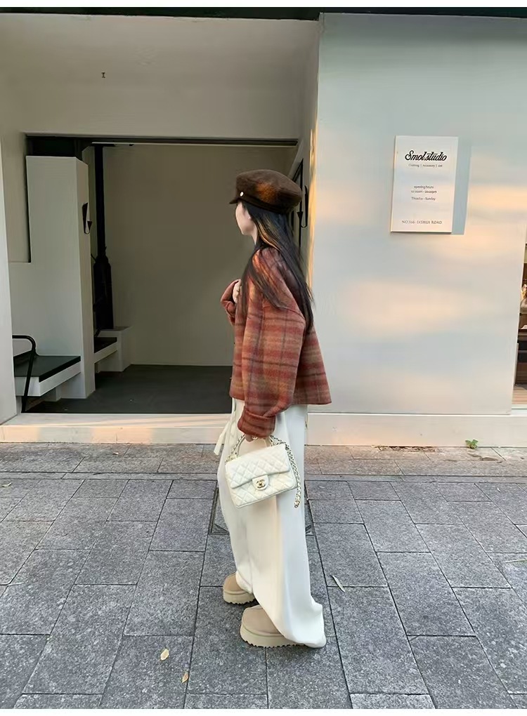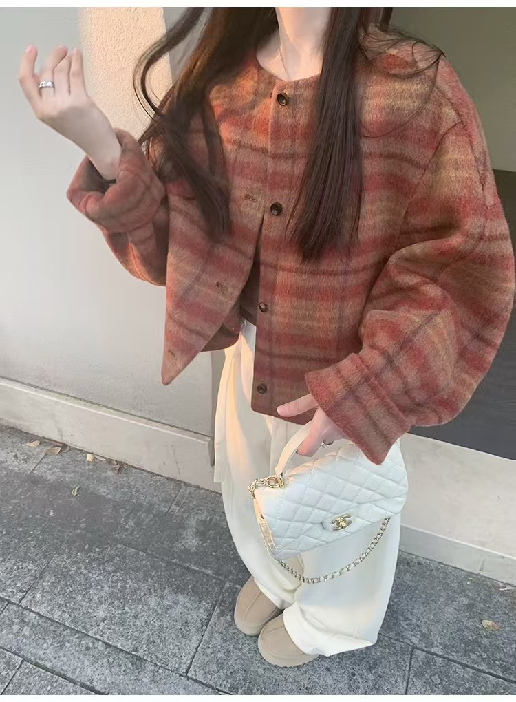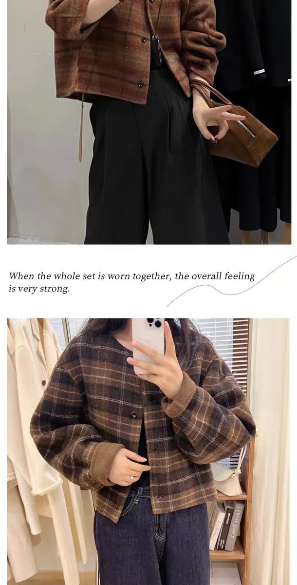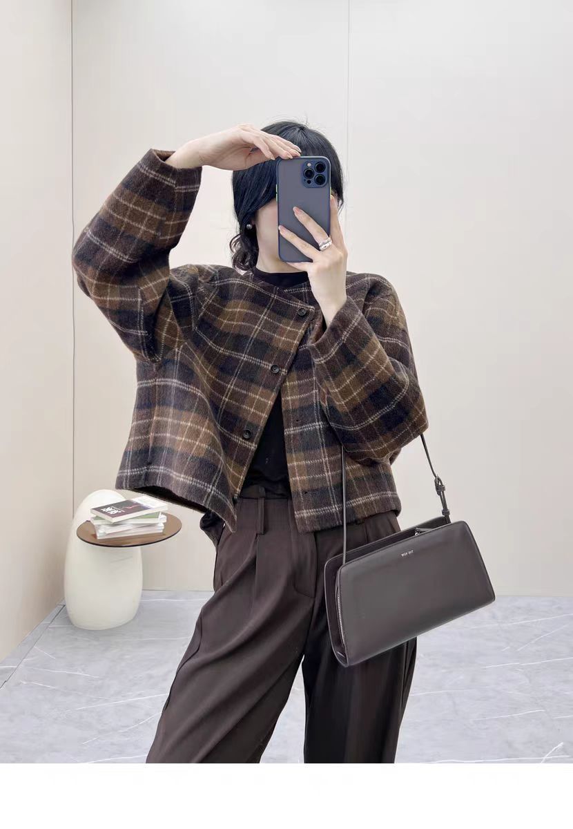 チェック柄両面カシミヤコート レディース ショート丈 シングルブレスト ゆったりウールコート チェック柄 通勤風 エレガントスタイル