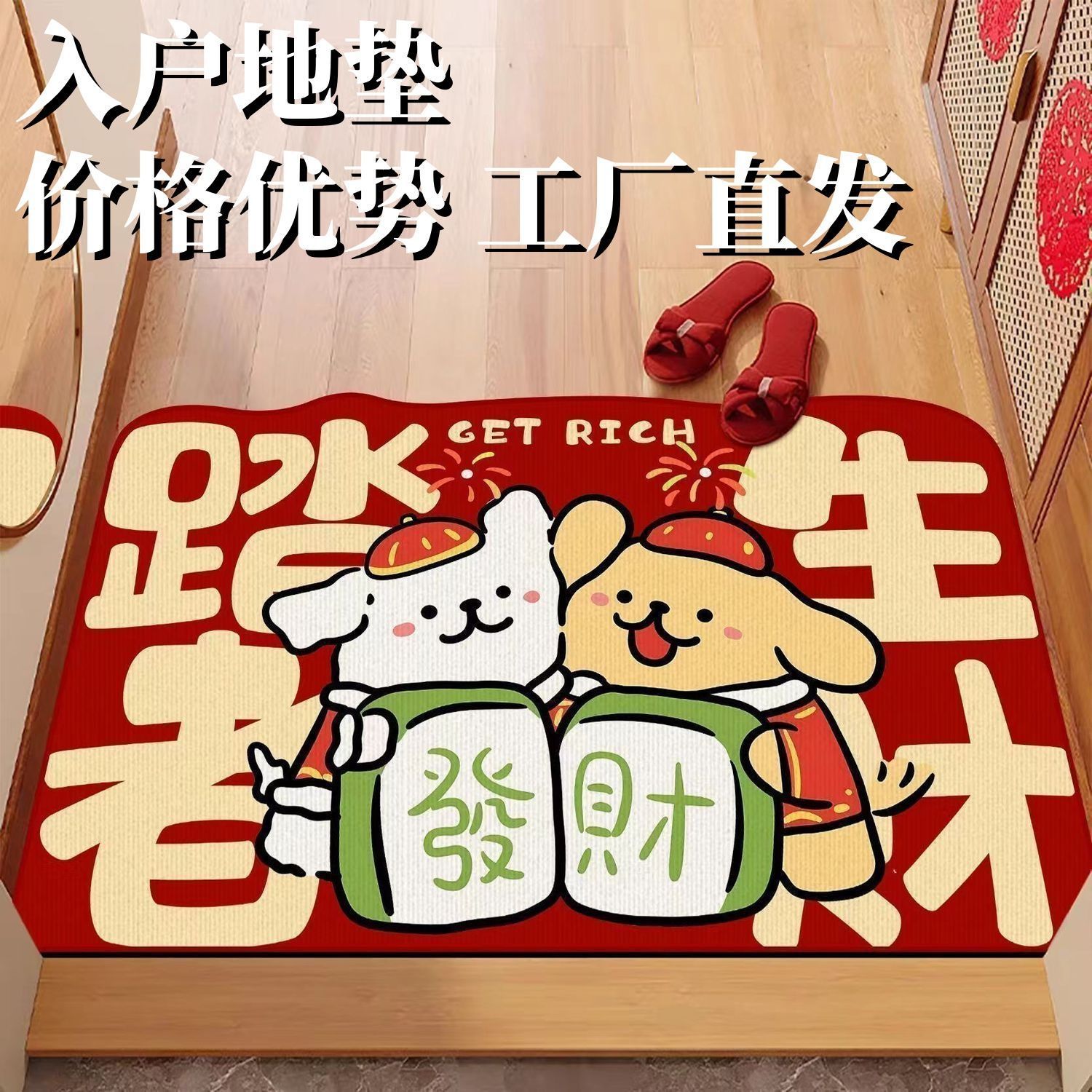 卡通红色喜庆线条小狗福气入户门地垫蹭土耐磨大门口防滑垫批发