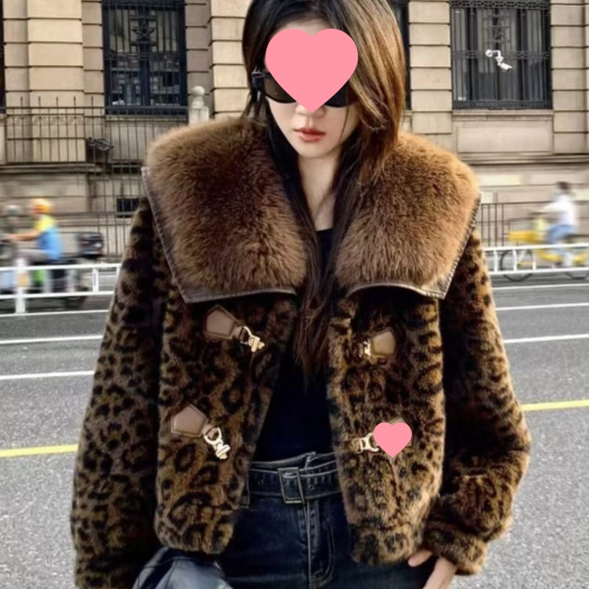 豹纹皮毛一体短款水貂加厚豹纹气质时尚秋冬新款大衣皮草外套