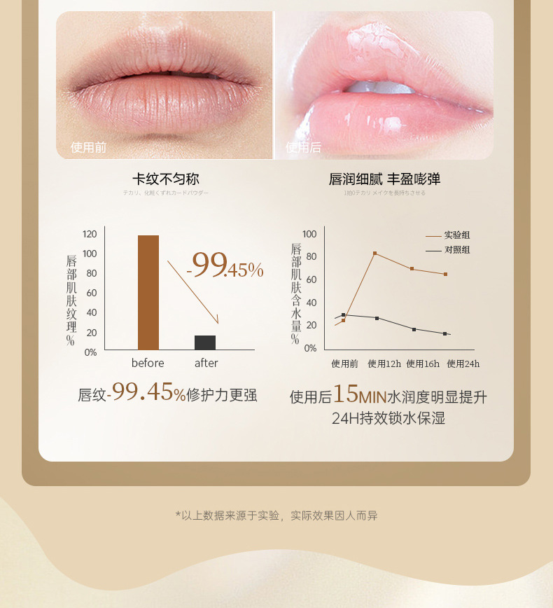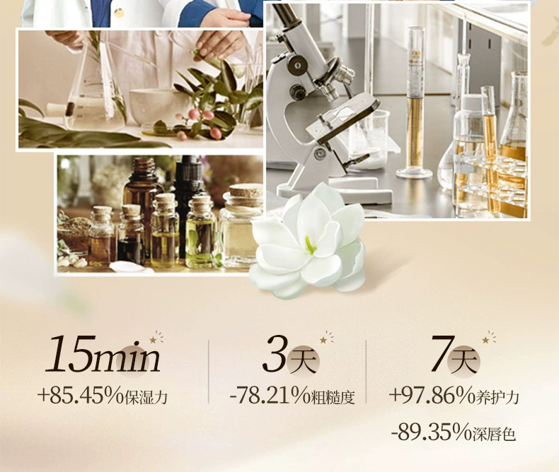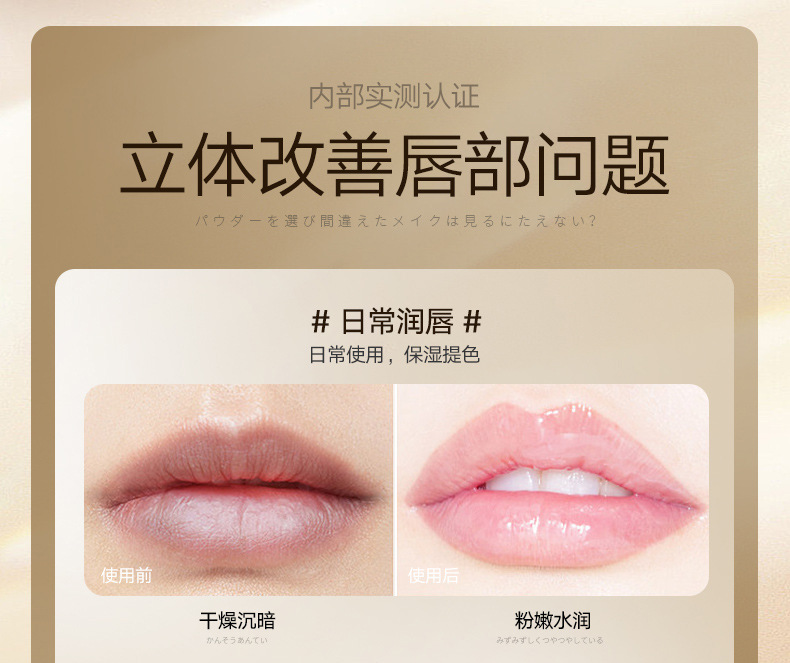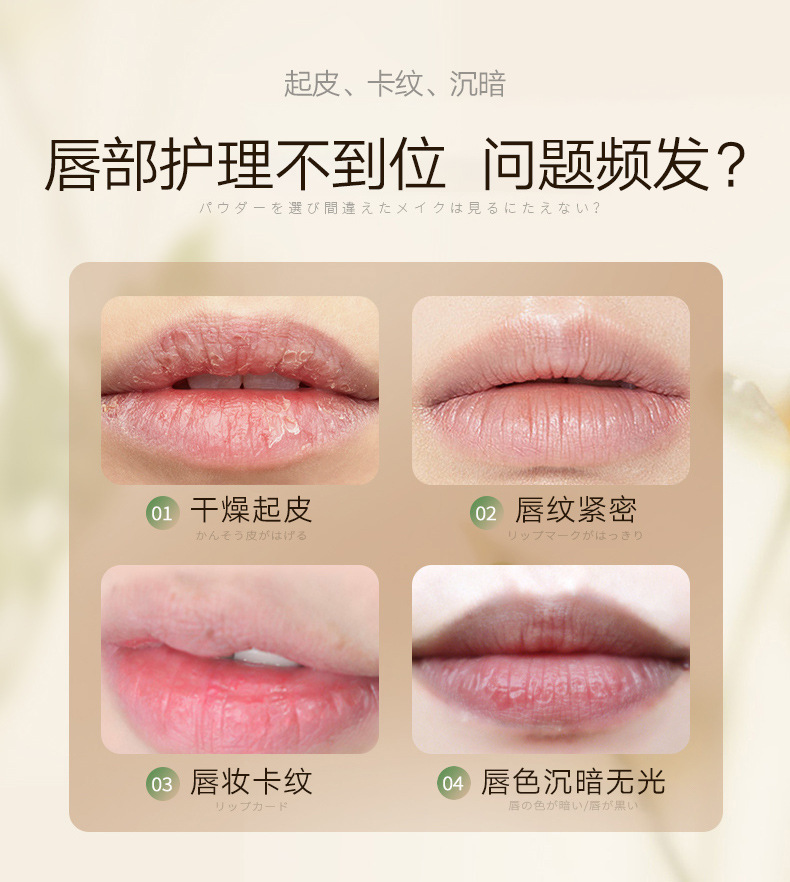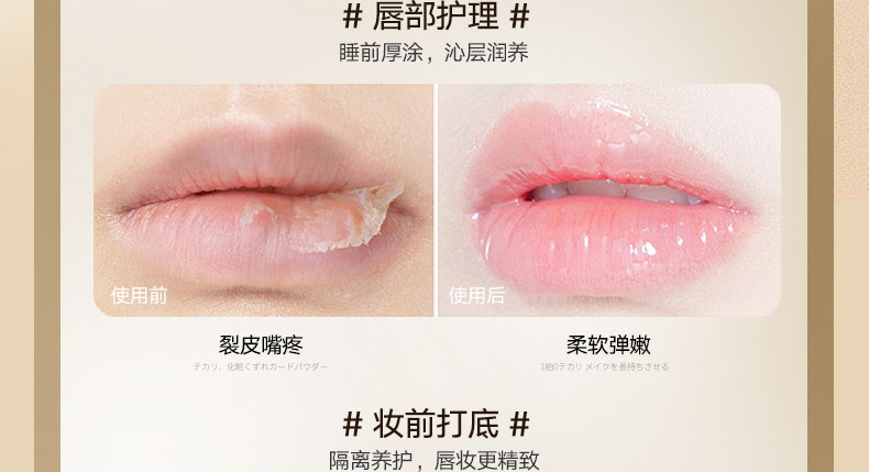 NOVOしなやかで潤いがあり、昼と夜の唇の膜が潤いを与え、水分を補い、保湿し、乾燥を防ぎ、唇の紋様を薄めます。