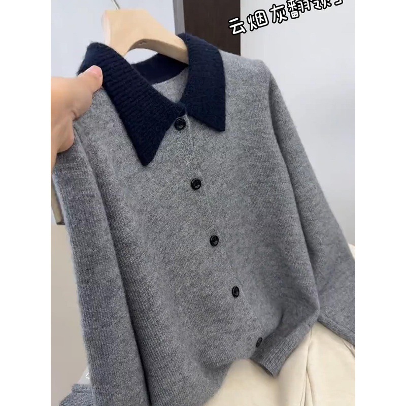 欧货高级感灰色翻领针织开衫女2025秋冬新款宽松显瘦百搭毛衣上衣
