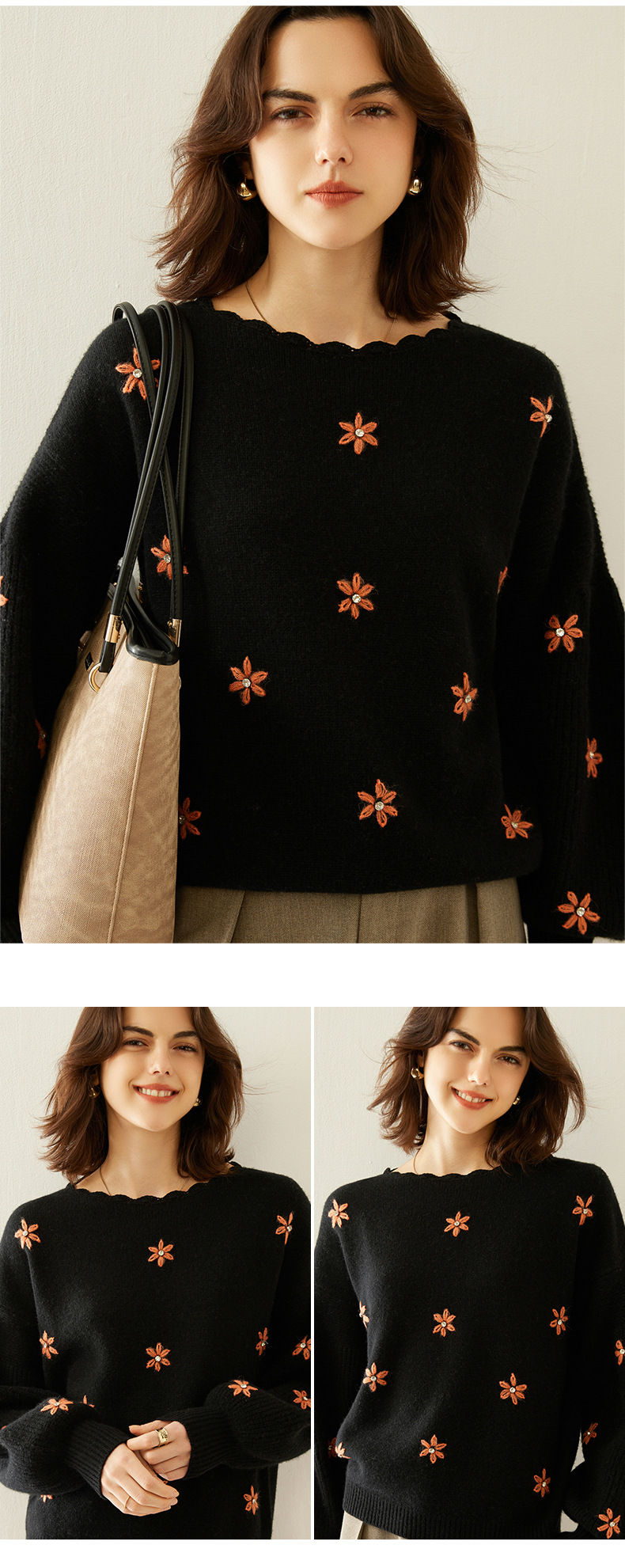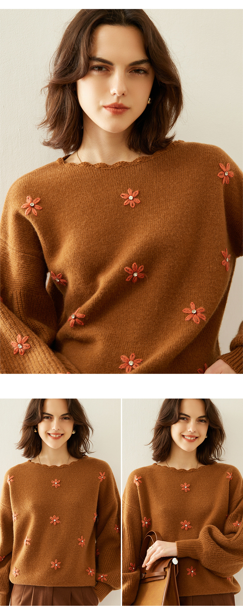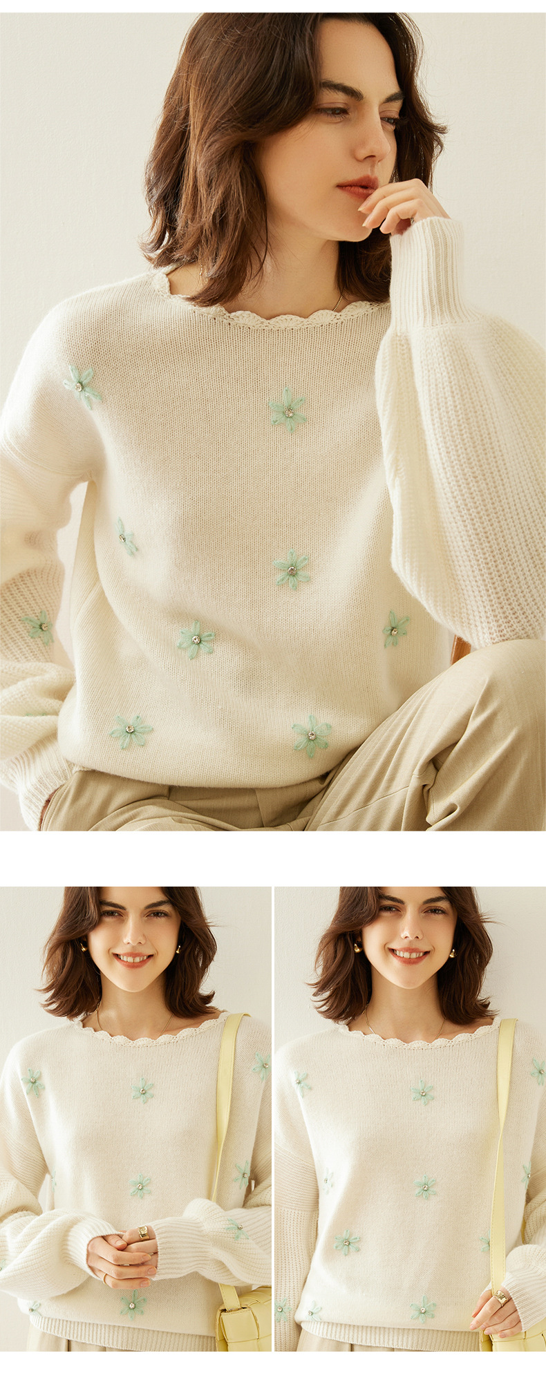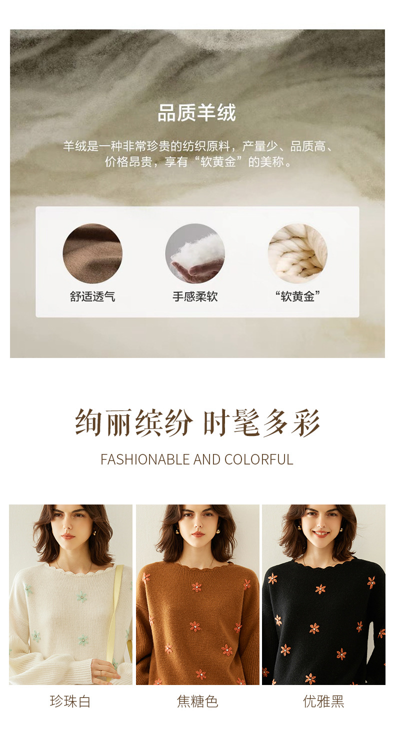 花の丸首の山のカシミヤのシャツの2024秋冬の新型の女性のレースの底のシャツの韓国系の風の灯籠の袖のプルオーバーのセーター