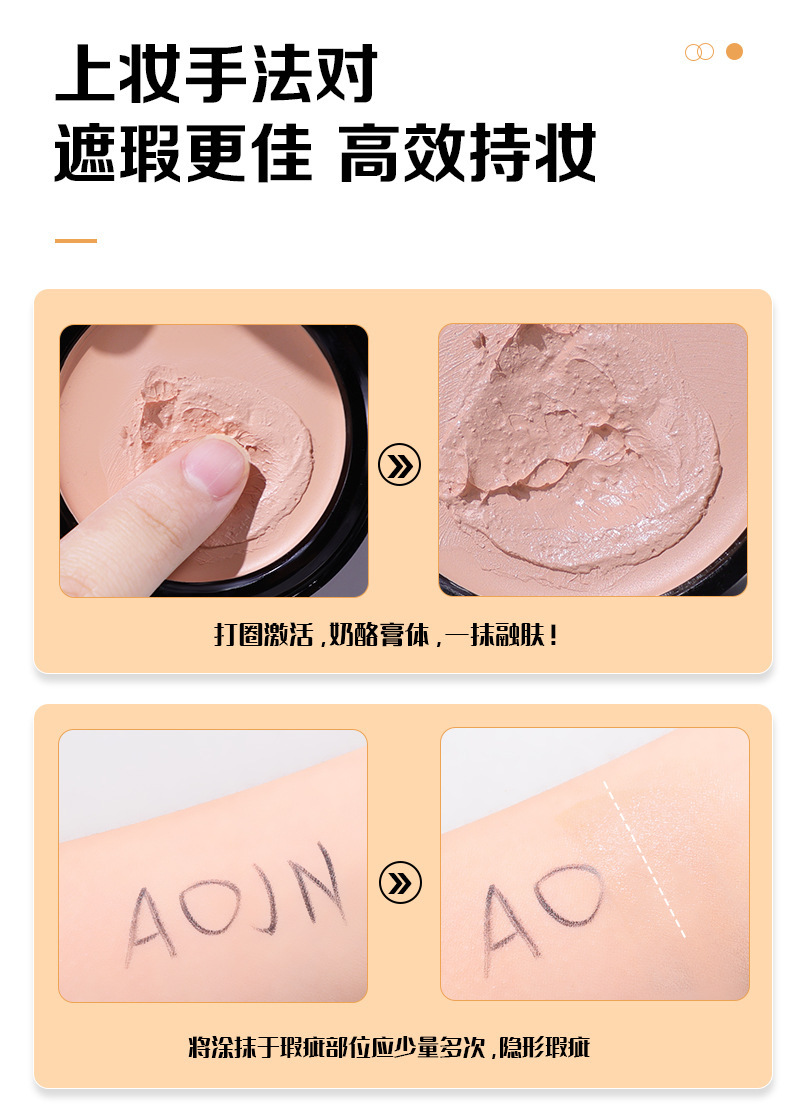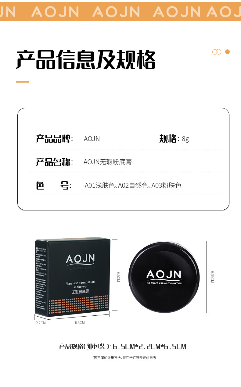 跨境专供爆款AOJN无痕粉底膏防水遮盖斑点痘印黑眼圈不脱妆粉底膏