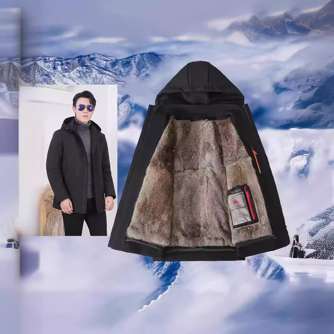 2024年冬 本物のウサギ毛皮一体型メンズパーカー、取り外し可能な帽子付き、ビジネス紳士向け
