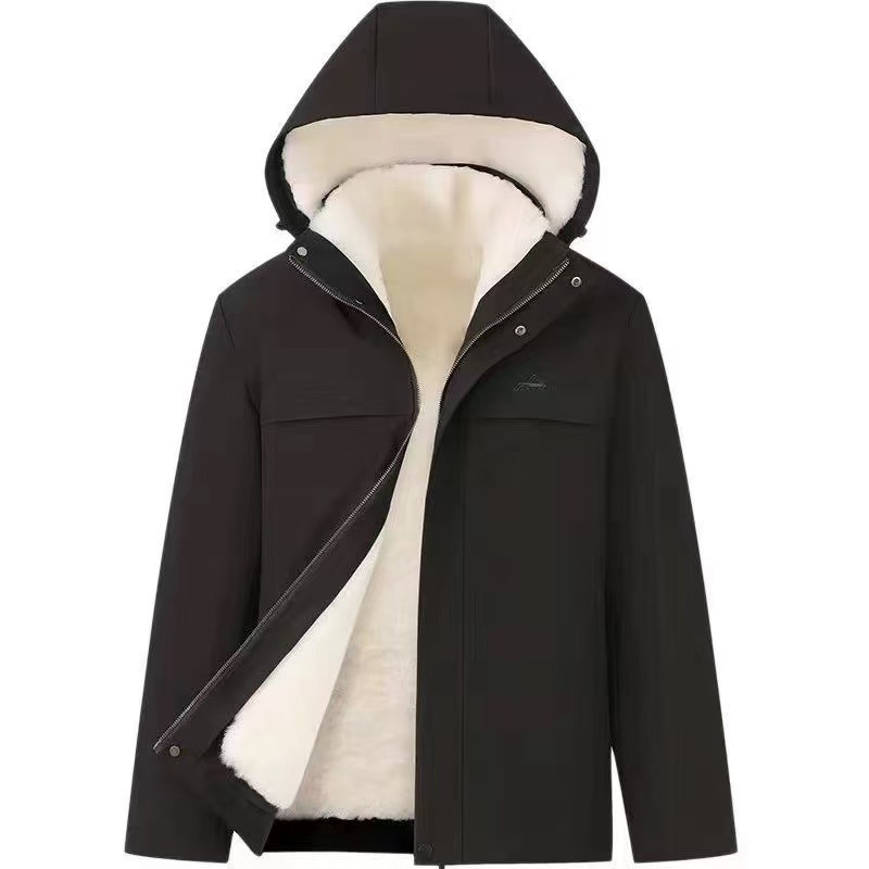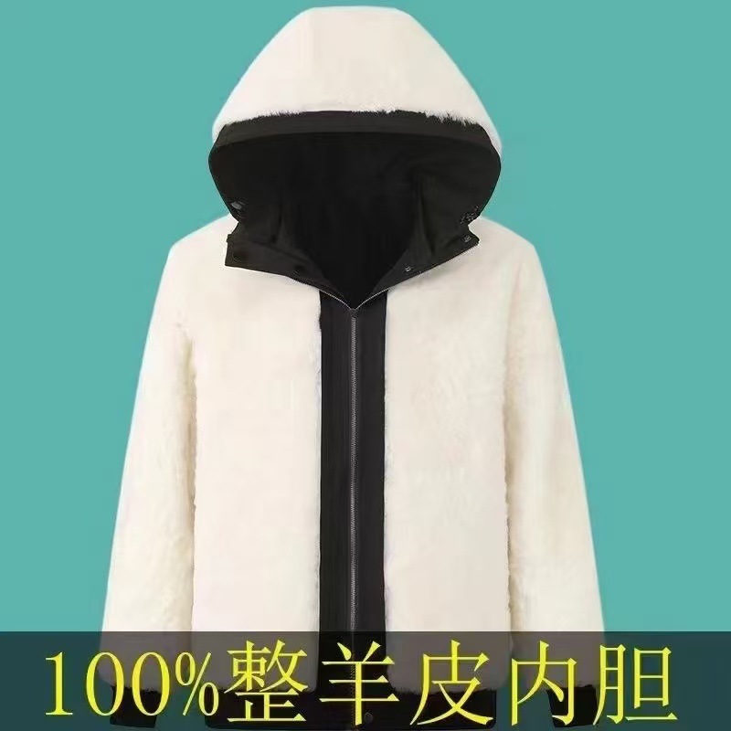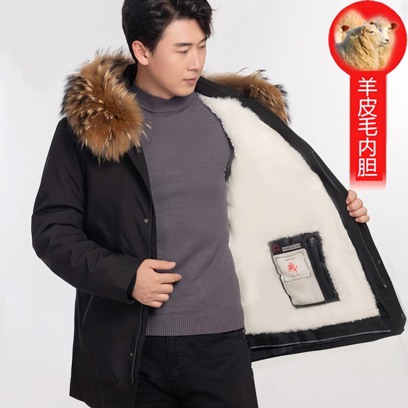 海寧の新型帽子付き男性オーストラリア羊皮内胆パーカーはカジュアルビジネス保温中年コートを取り外すことができる