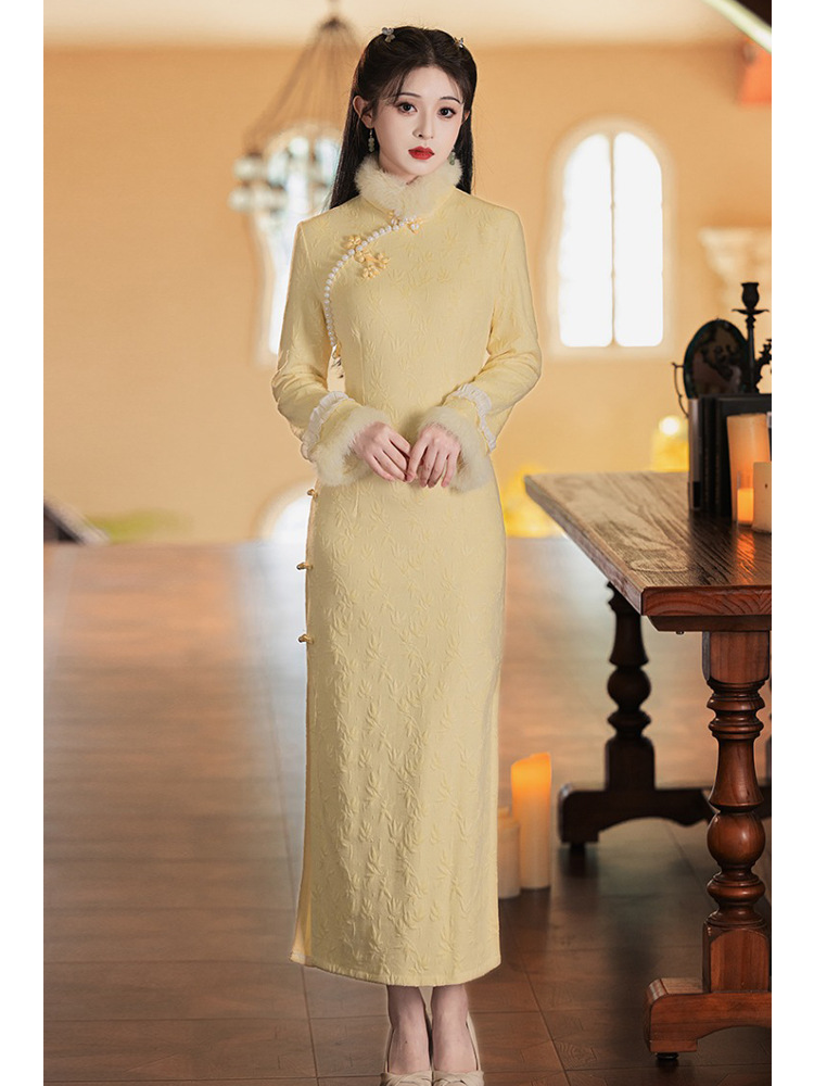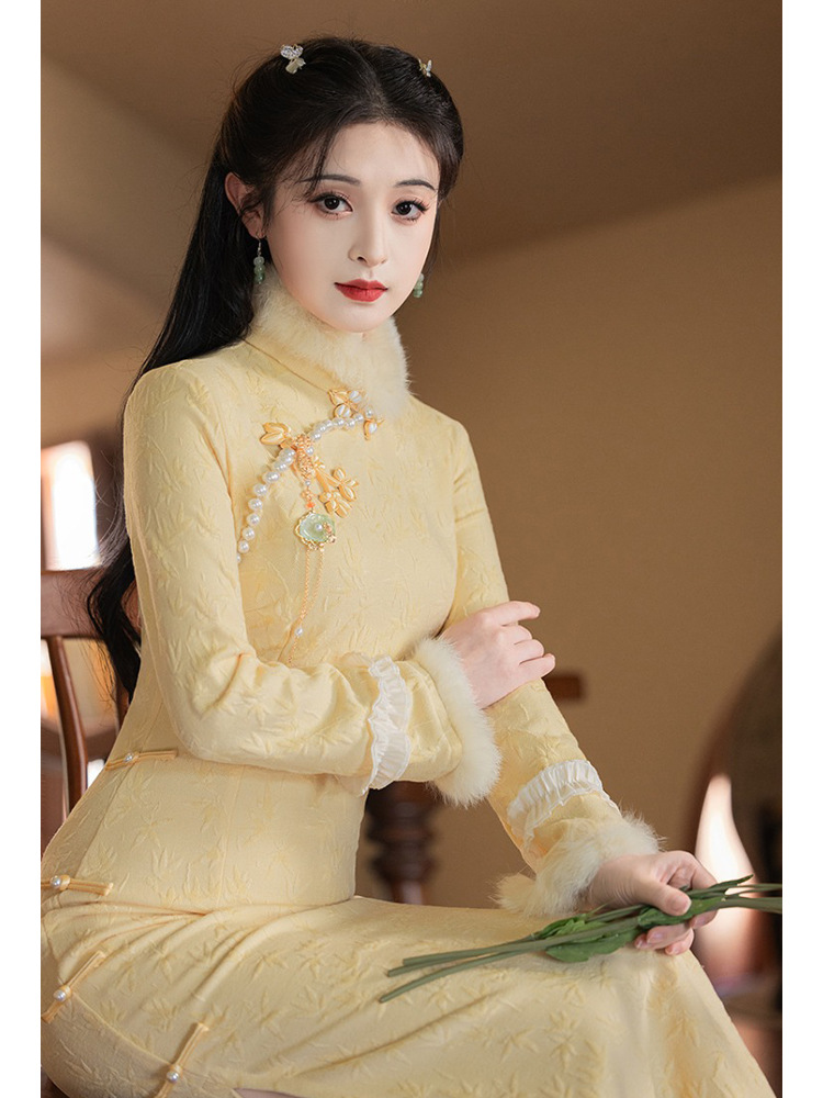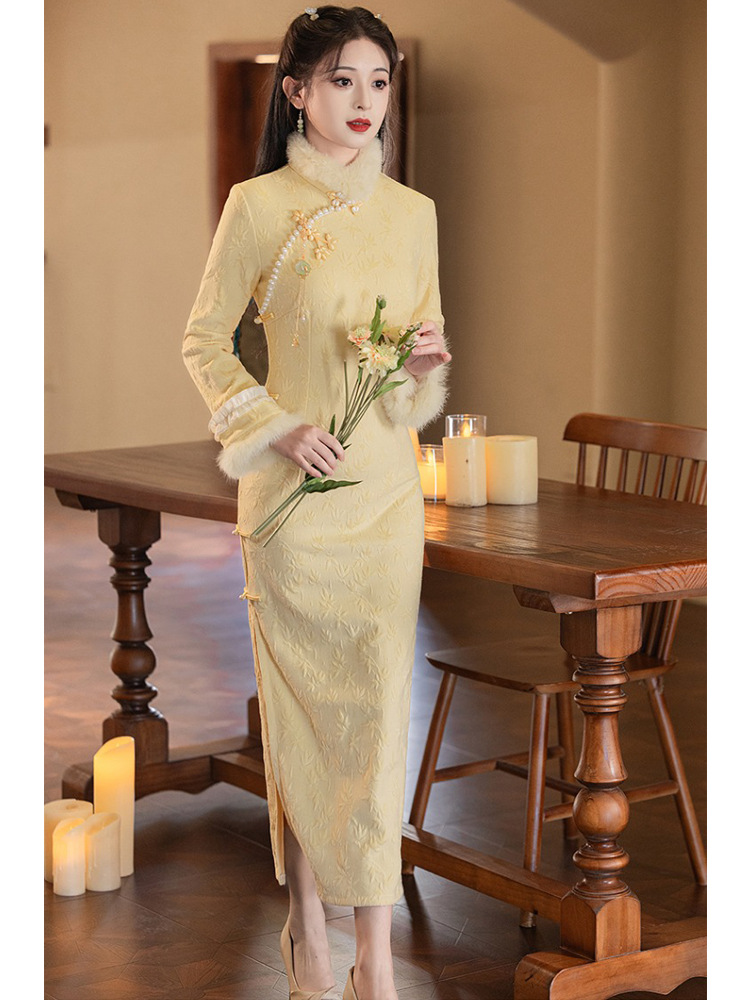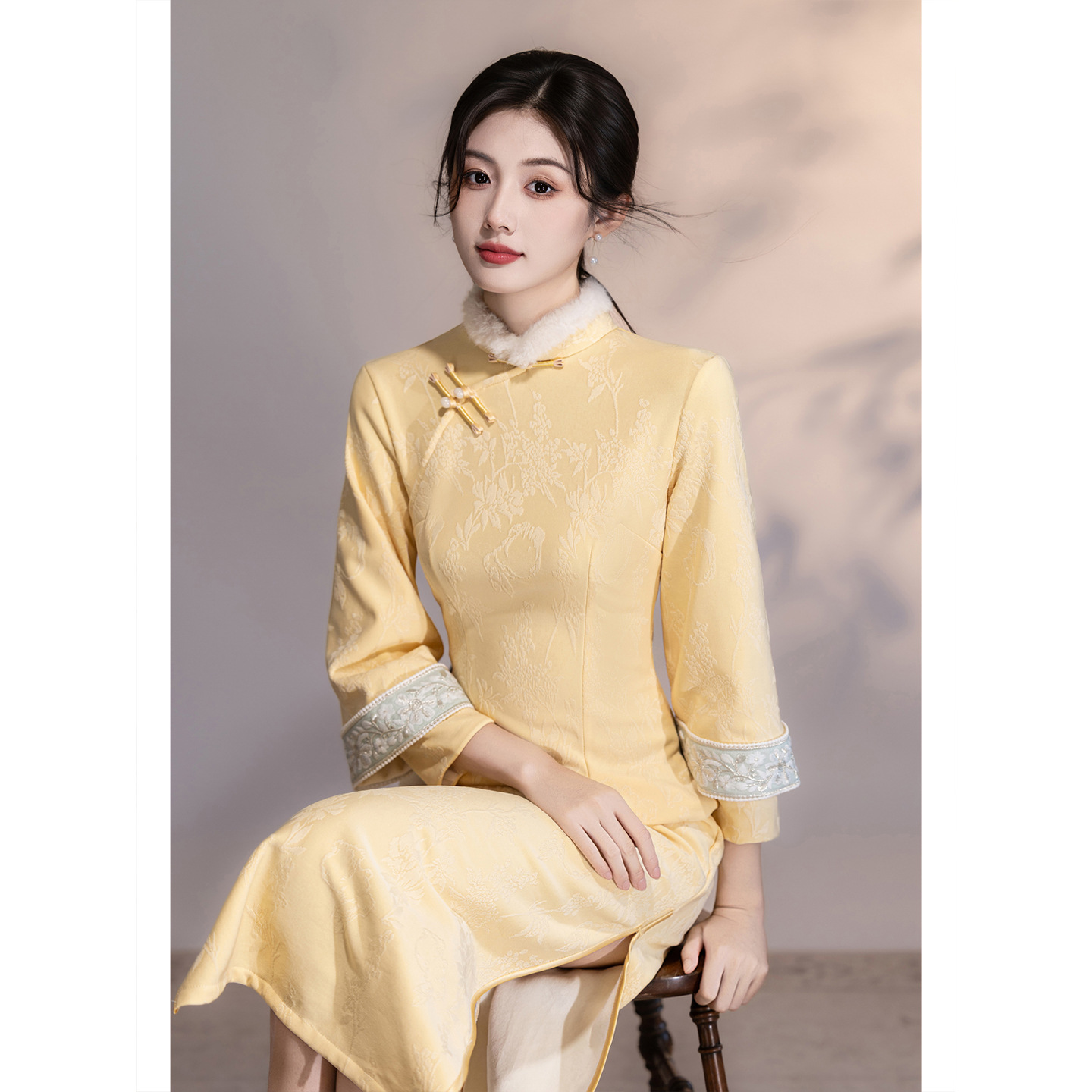 チーズ黄色チャイナドレス2024新型高級修身秋冬金新中国式日常は冬に長袖を厚くすることができる
