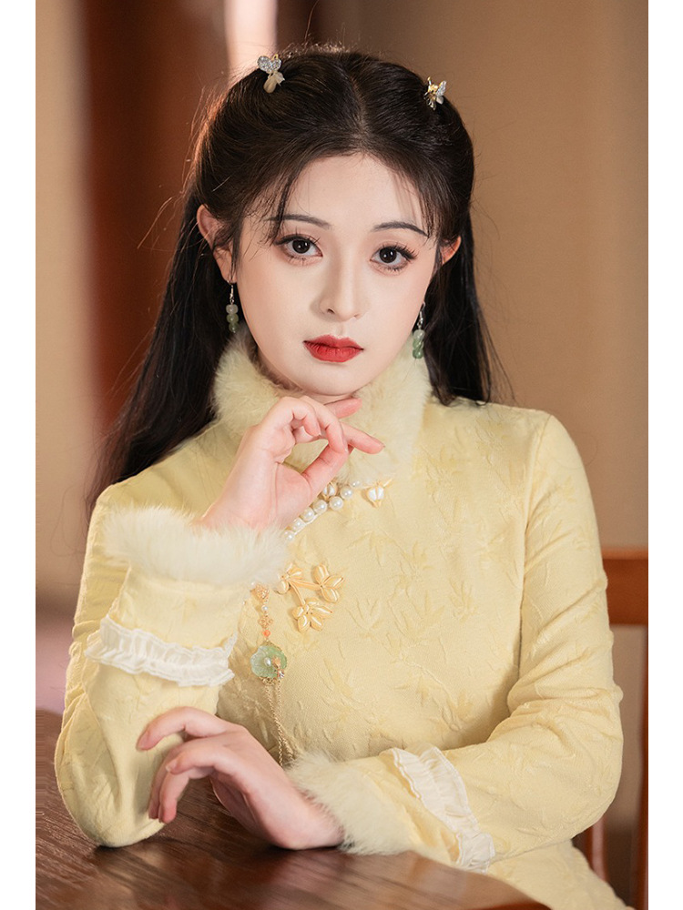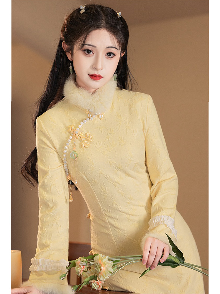 黄色毛领旗袍2025新款冬季长袖改良新中式加绒刺绣连衣裙气质高端