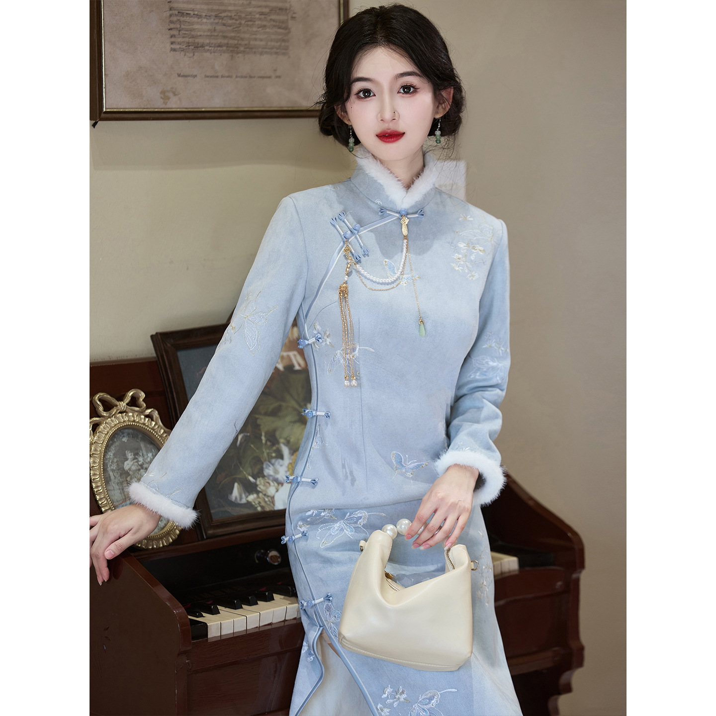 蓝色绝美秋冬款旗袍长袖新中式连衣裙保暖加厚日常年轻款温柔