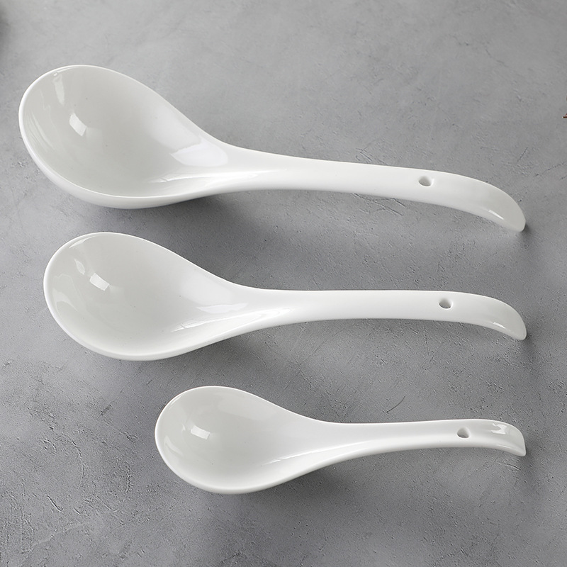 純白の長い柄の陶磁器の大きいスープのスプーンのマグネシウムの磁器の2曲のスプーン