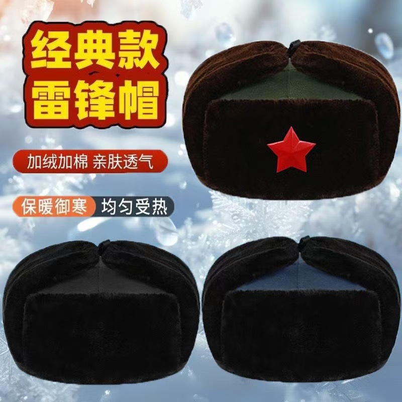 雷鋒帽男中高年綿帽機関車頭五角星帽子紅軍帽子保温帽冬帽子耳保護帽