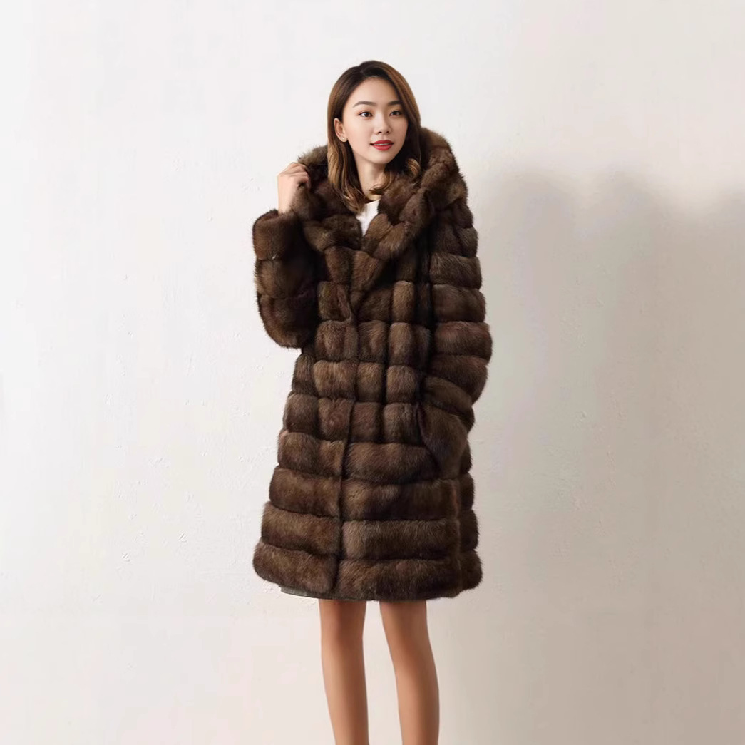 婦人服はミンクの毛皮のコートの中の長さをまねて、帽子のコートの毛皮の大きいサイズとカジュアルな保温がゆったりしています。
