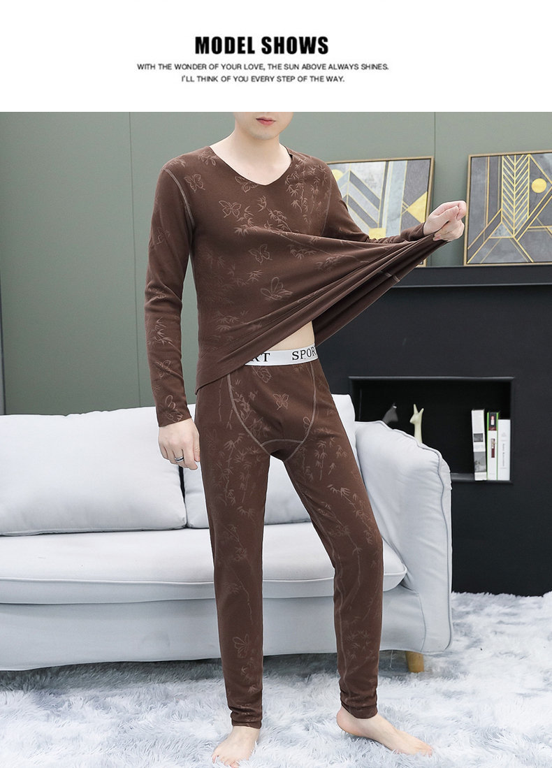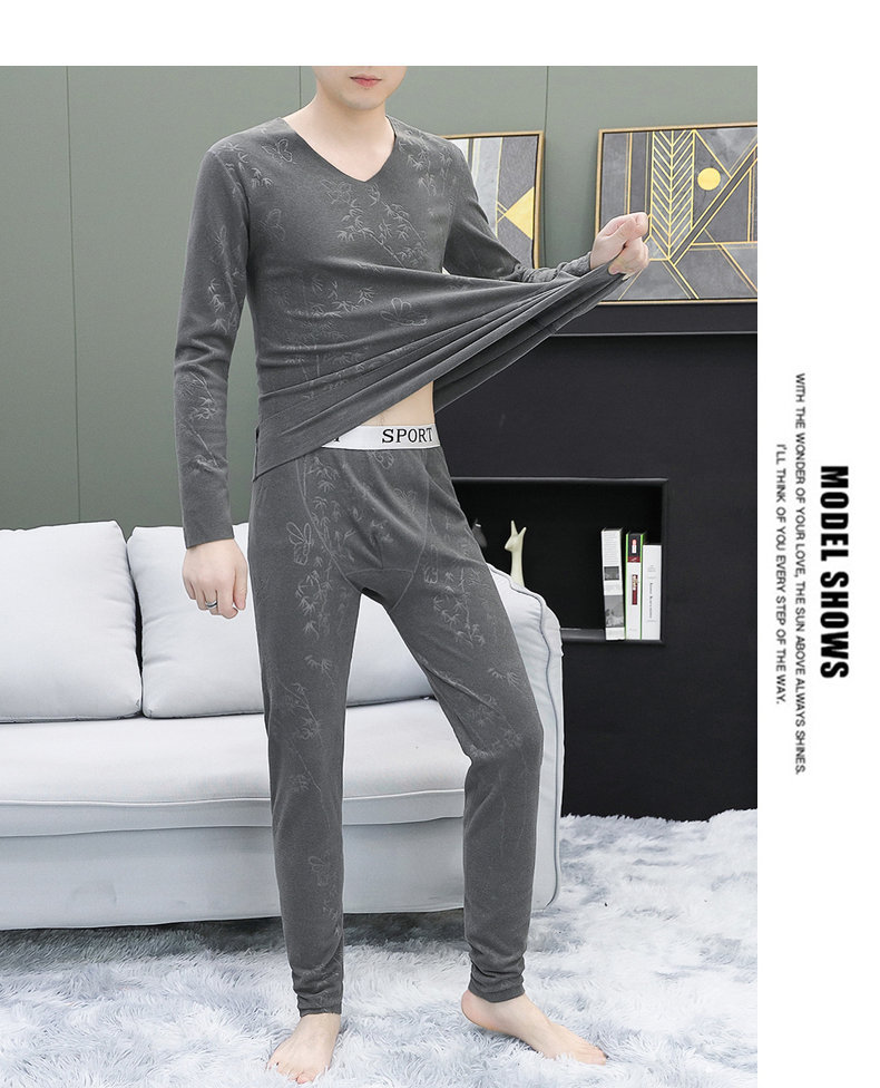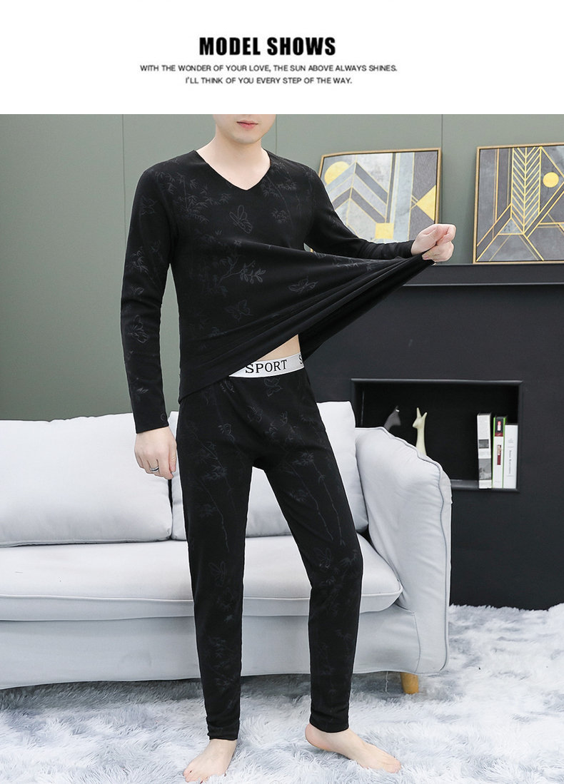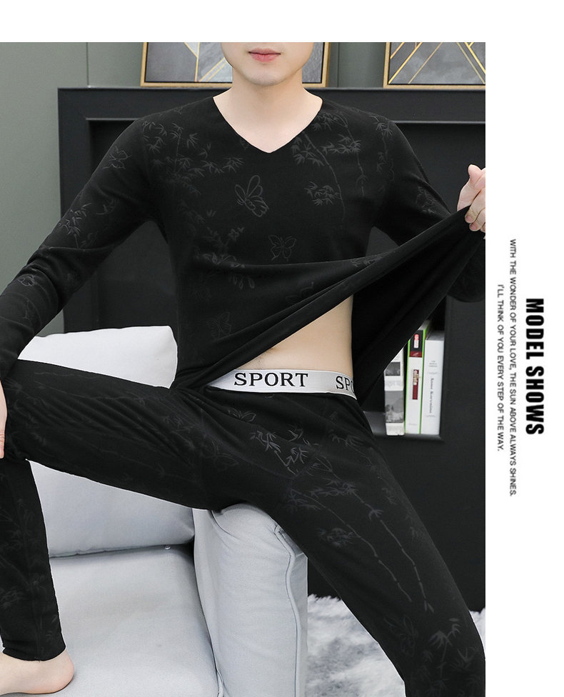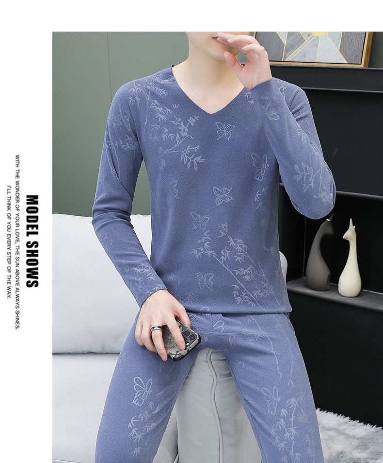 男性の保温下着の徳絨無痕vネックの肌着発熱ボトムシャツの男性タイプの青年秋衣秋ズボンセット